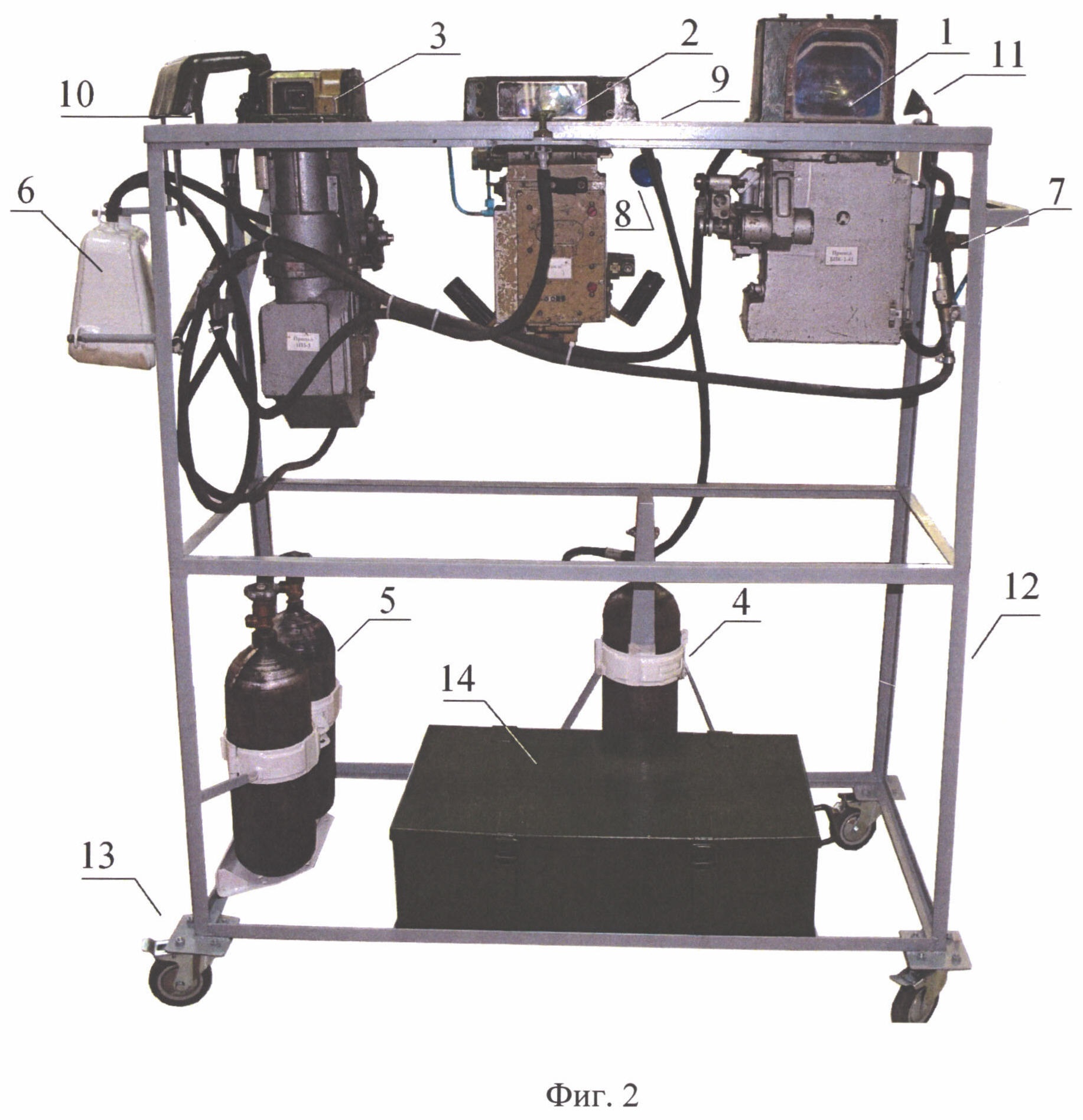 на фиг. 2 и на фиг. 3 изображен общий вид установки, где: 1 - прицел БПК-2-42; 2 - прибор наблюдения ТКН-3Б; 3 - прицел 1ПЗ-3; 4 - основной баллон со сжатым воздухом; 5 - запасной баллон со сжатым воздухом; 6 - бак для жидкости; 7 - кран; 8 - манометр; 9 - редуктор давления ИЛ611-150-65; 10 - трубка очистки; 11 - распылитель и трубопроводы; 12 - переносной металлический несущий каркас; 13 - колесо транспортное; 14 - ящик для хранения запасных частей и принадлежностей.