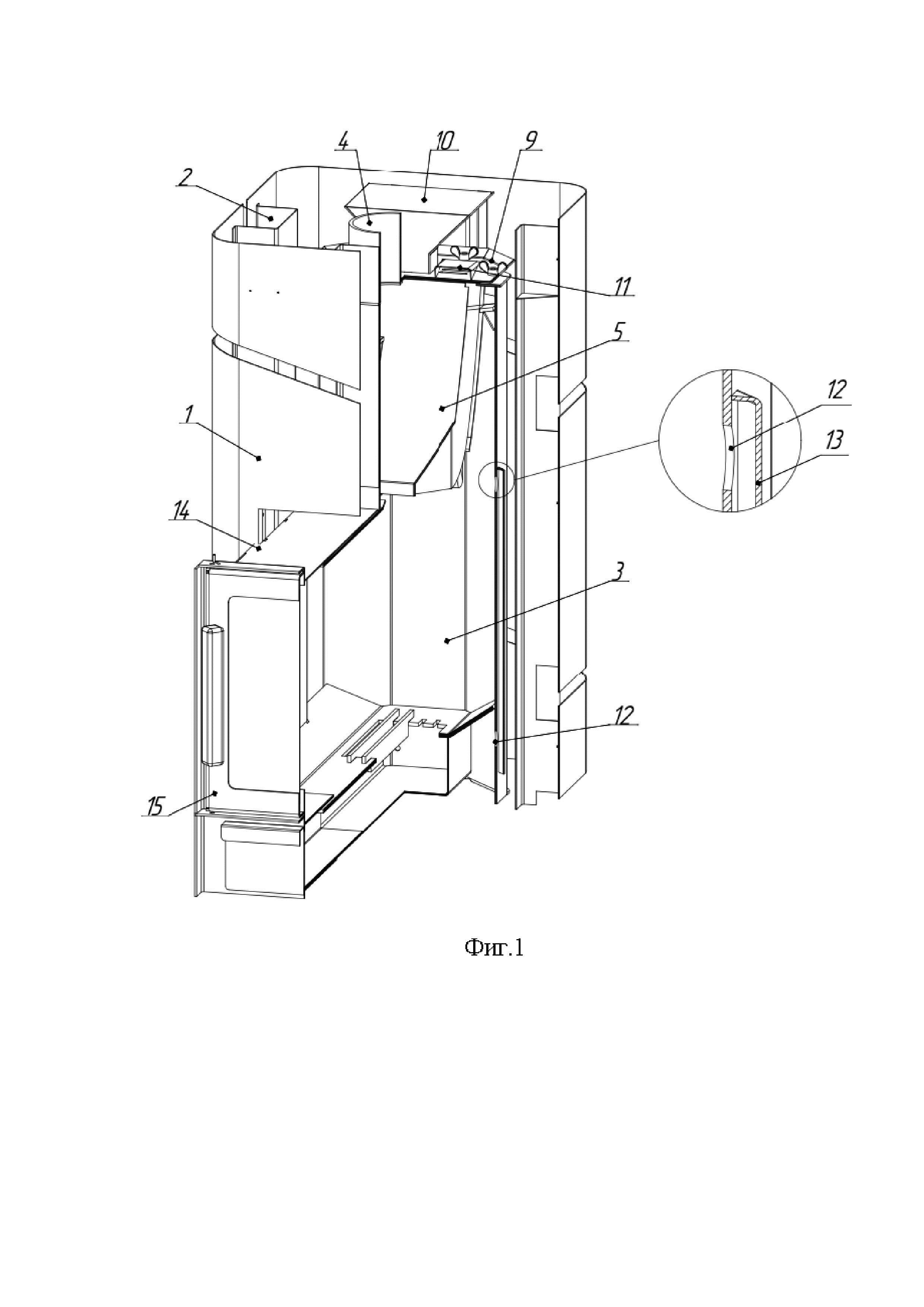 Область техники, к которой относится полезная модель Устройство относится к области теплотехники, в частности, к конструкции теплотехнического устройства, предназначенного для отопления и парообразования, и может быть использовано для оборудования бань и саун. Конструкция устройства позволяет использовать различные сочетания температуры и влажности воздуха, создавая режимы мелкодисперсного пара, классического пара и сауны. Уровень техники Известно устройство - печь для бани Услада (URL https://www.pban.ru/production/bannye-pechi-uslada/zhara-uslada-20s/), состоящее из сетки-каменки, корпуса топки и установленной съемной закрытой каменкой модульного типа, топочного короба с колосниковой решеткой, зольным совком и панорамной дверцей. Недостатком данного устройства является сложность обслуживания закрытой каменки (для обслуживания необходимо разобрать весь дымоход), невозможность пользоваться устройством без закрытой каменки, возможны лишь варианты использования в печи разных модулей. Также известно устройство - дровяная печь для бани (URL https://ermak-termo.ru/catalog/bannie-pechi-na-drovah/ermak-16-standart-st/?opts=y&opt[]=2077), взятое за прототип, содержащее металлический кожух, топочную камеру с колосниковой решеткой и дверцей, зольник с зольным ящиком, патрубок дымохода и открытую каменку с возможностью установки модуля закрытой каменки и парообразователя. Модуль устанавливается поверх открытой каменки, образуя закрытое пространство в каменке. Недостатком данной печи является сложность установки модуля (URL https://www.youtube.com/watch?v=ZGFeMJ1W5mA&t=1044s), малый объем закрытой каменки. Техническая задача - улучшение потребительских свойств устройства. Техническим результатом является улучшение конструкции устройства, что позволяет расширить функциональные возможности устройства для получения различных режимов парообразования, обеспечить легкость обслуживания и смены оборудования, эффективность схемы прогрева камней и парильного помещения. Раскрытие сущности полезной модели Основными элементами устройства являются: металлический кожух в форме правильного параллелепипеда с узкими круговыми прорезями на его поверхности; топка печи с двумя каналами дожига, модуль закрытой каменки, включающий в себя корпус закрытой каменки и крышку с бортиками, на которой расположены воронка для подачи воды и небольшое сопло, которое служит местом выхода мелкодисперсного пара, плиту отбойника, перекрывающую прямой ход газов и пламени из топки в трубу и способствующую полному сгоранию топлива; топливный канал в виде горизонтально расположенного параллелепипеда с двойной верхней защитой в виде пластин с небольшим зазором между ними, позволяющим направлять горячий воздух из топки непосредственно к закрытой каменке, топить в самом топочном канале; дверца в виде прямоугольной рамки со смотровым стеклом; колосниковая решетка на дне топки; зольный ящик под топочным каналом. На боковых поверхностях топки расположены отверстия, снаружи топки приварены вертикально уголки с закрытой верхней частью, прикрывающие эти отверстия и образующие каналы, через эти каналы дожига снизу поступает воздух и улучшает процессы горения в печи. Эти же уголки служат также дополнительными ребрами жесткости. Модуль закрытой каменки выполнен изогнутым и «садится» на опору, закрепленную на стенке топки. Благодаря конструкции 