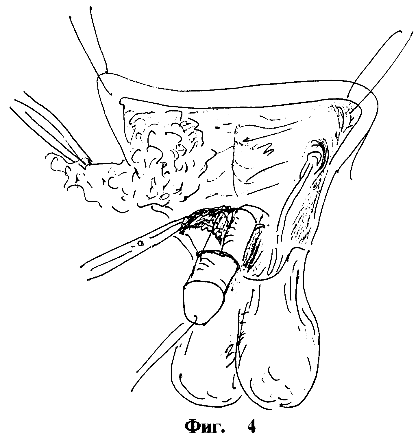 Операцию начинают с циркулярного рассечения кожи в области основания полового члена с продолжением разреза на паховую складку с обеих сторон (фиг. 1). Кожу передней брюшной стенки берут на держалки и лоскут поднимают кверху, обнажая широкий доступ к лонной области. Идентифицируют нейроваскулярный комплекс в фасции Бакка (Buck), расположенный по средней линии на дорсальной поверхности кавернозных тел в более глубоком слое, который необходимо сохранить при выделении и иссечении поверхностных неэластичных соединительно-тканых тяжей, распостраняющихся от венечной борозды до лонного сочленения (фиг. 2). Далее иссекают подкожную жировую клетчатку, избыточно развитую в лонной области (фиг. 3). Особая осторожность необходима при удалении клетчатки в проекции наружного пахового кольца, где выходят элементы семенного канатика (фиг. 4). Следующим этапом кожу передней брюшной стенки фиксируют к симфизу. Накладывают несколько узловых швов на подкожные ткани и 3-4 внутрикожных шва для хорошего сопоставления супрапубикальной кожи с лонным сочленением (фиг. 5). Этот прием позволяет максимально визуализировать кавернозные тела, вывести их на поверхность во всю длину. В качестве шовного материала используют длительно рассасывающиеся прочные монофиламентные нити (Prolene, PDS, Maxon) 00.