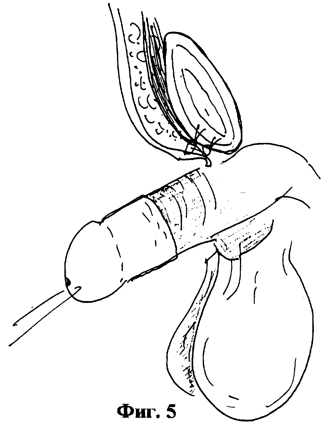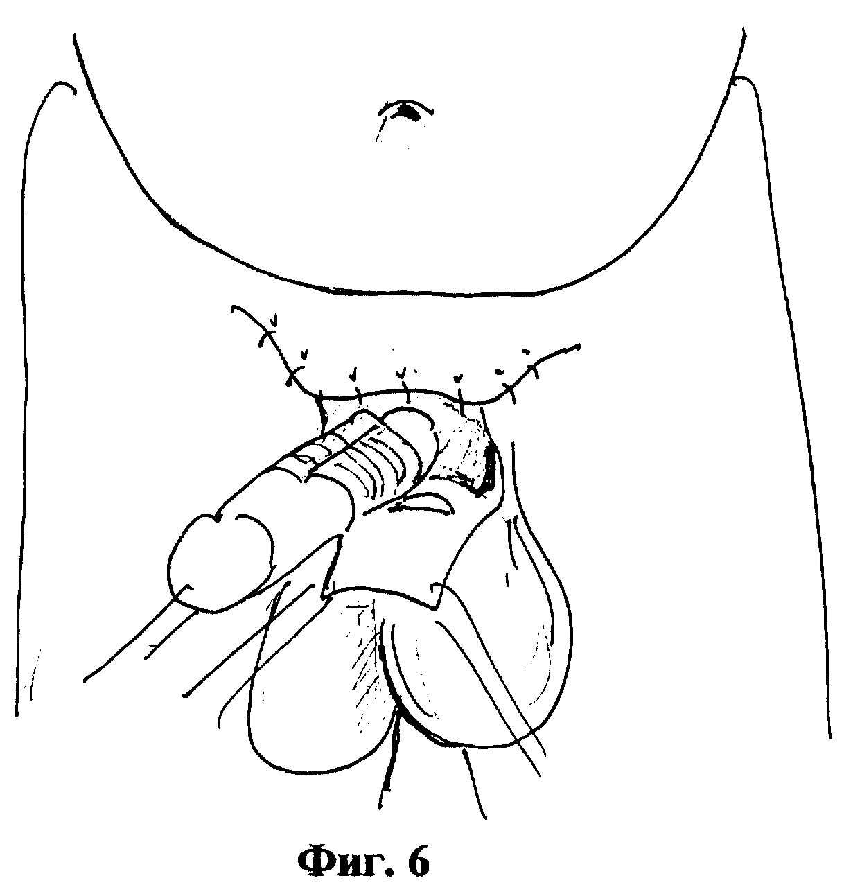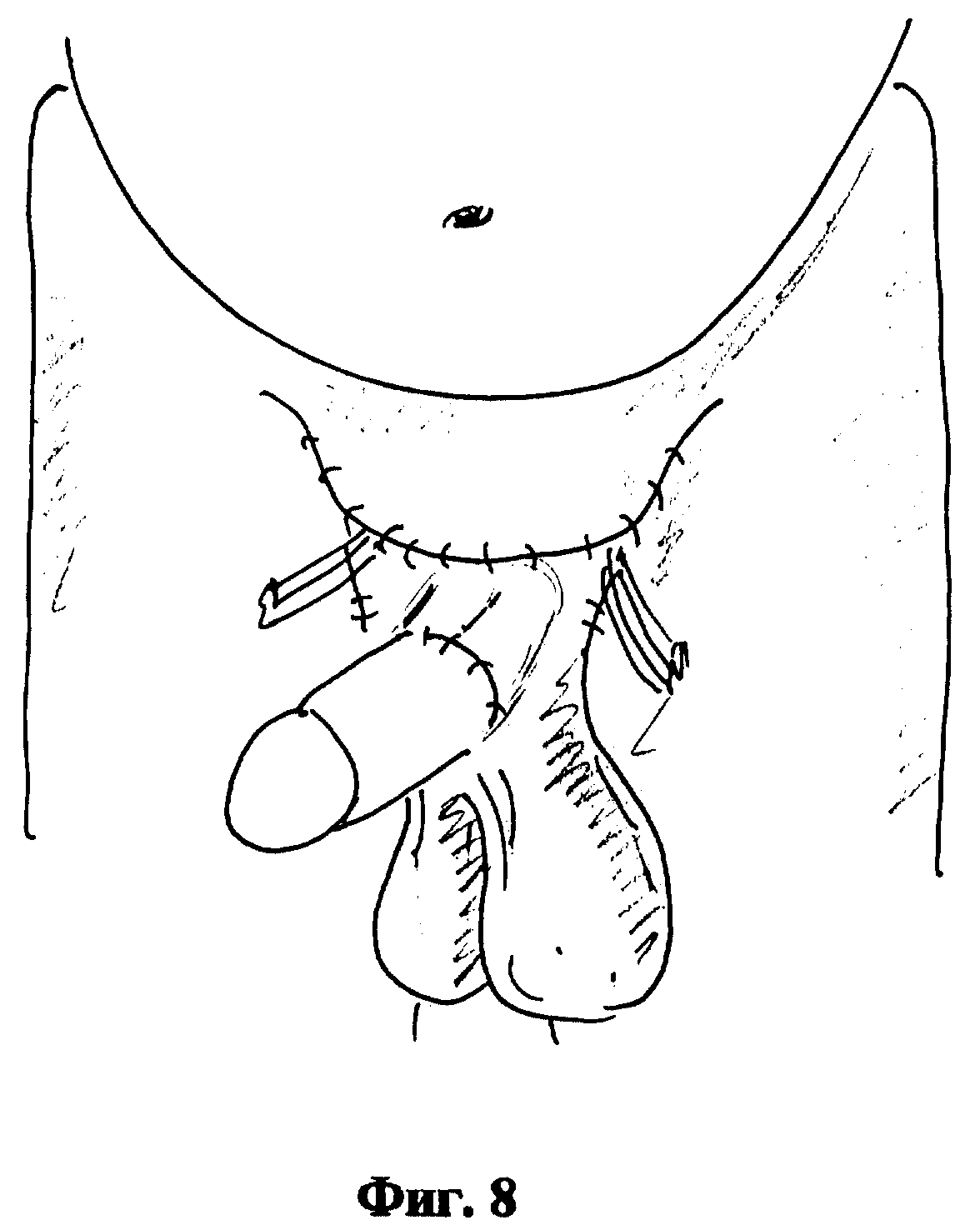 Циркулярный дефект кожи в области основания полового члена, возникающий после мобилизации кавернозных тел, обычно, закрывают, используя подвижную крайнюю плоть, перемещая ее со ствола на основание (фиг.6). Для закрытия дефекта кожи выкраивают квадратный лоскут на мошонке, по ширине равный двум диаметрам кавернозных тел. В основании лоскута создают отверстие, равное диаметру полового члена (фиг. 7). Для перемещения лоскута в зону дефекта кожи, кавернозные тела проводят через отверстие в основании лоскута. Накладывают сопоставляющие швы на кожу лоскута и полового члена и фиксируют лоскут к передней брюшной стенке (фиг. 8). Рану ушивают послойно, оставляя резиновые выпускники в лонной области, где проводили иссечение жировой клетчатки на значительном протяжении для предупреждения скопления гематомы и инфицирования п/о раны. Операцию завершают наложением асептической повязки на послеоперационную рану и циркулярной повязки с глицерином на ствол полового члена, которая оказывает гемостатическое действие в раннем послеоперационном периоде, кроме того глицерин сдерживает нарастание отека тканей и является хорошим антисептиком.