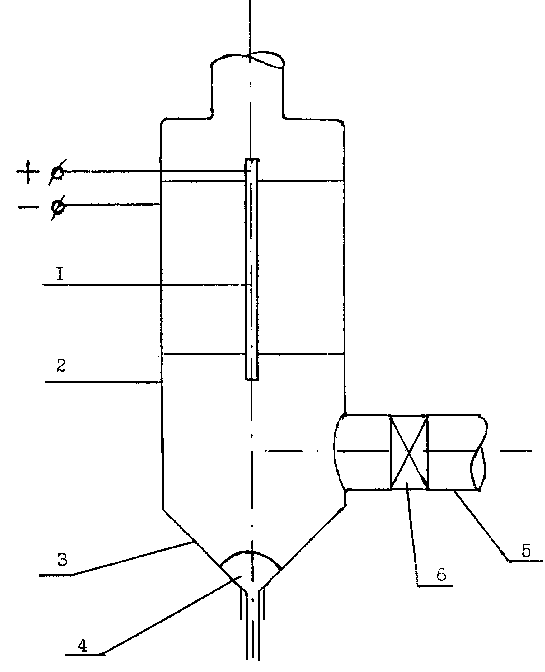 осуществляется следующим образом. В устройстве (см. чертеж) анодом 1 служит электрод, размещенный коаксиально внутри корпуса 2 электролизера по всей его длине. В нижней части