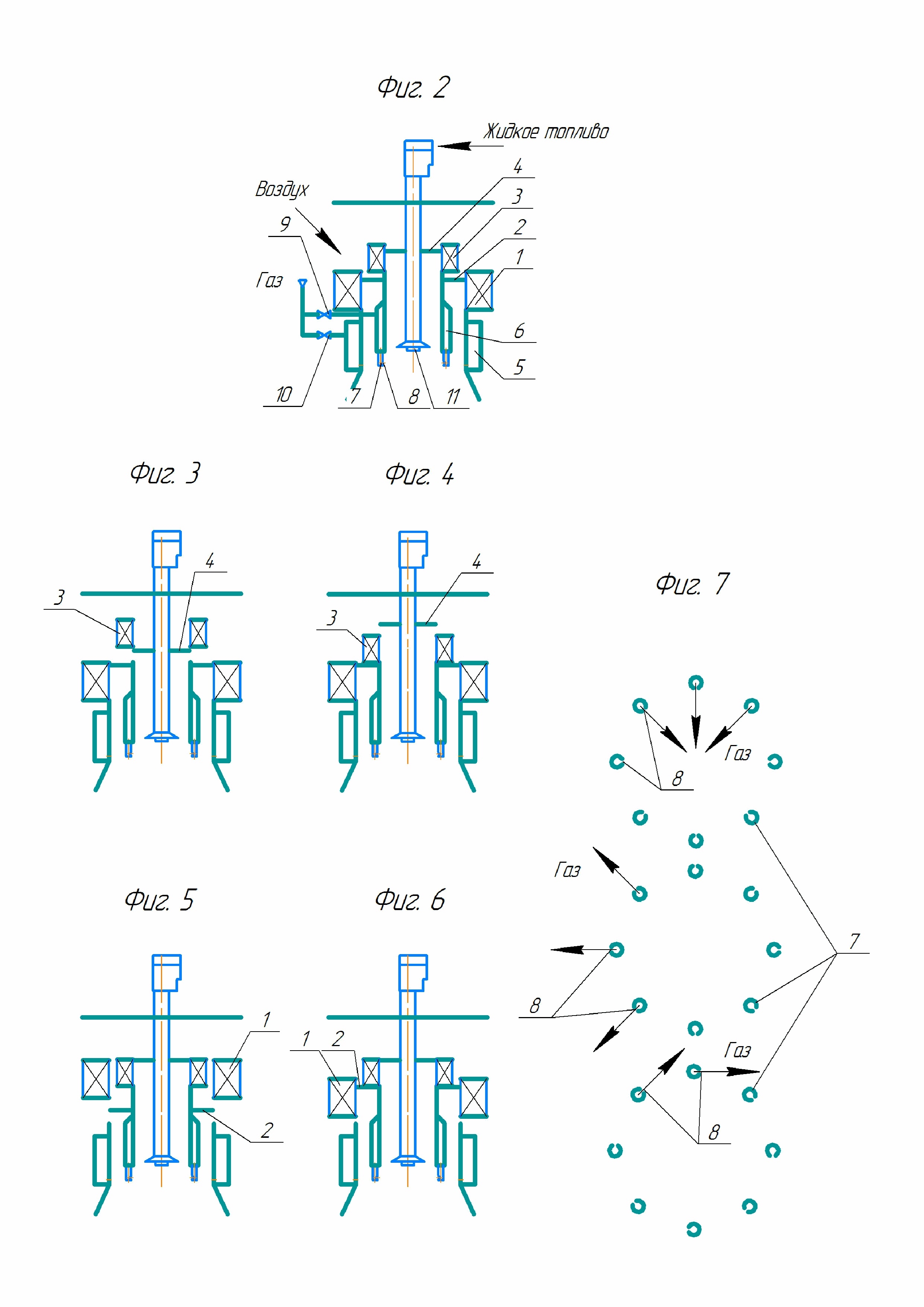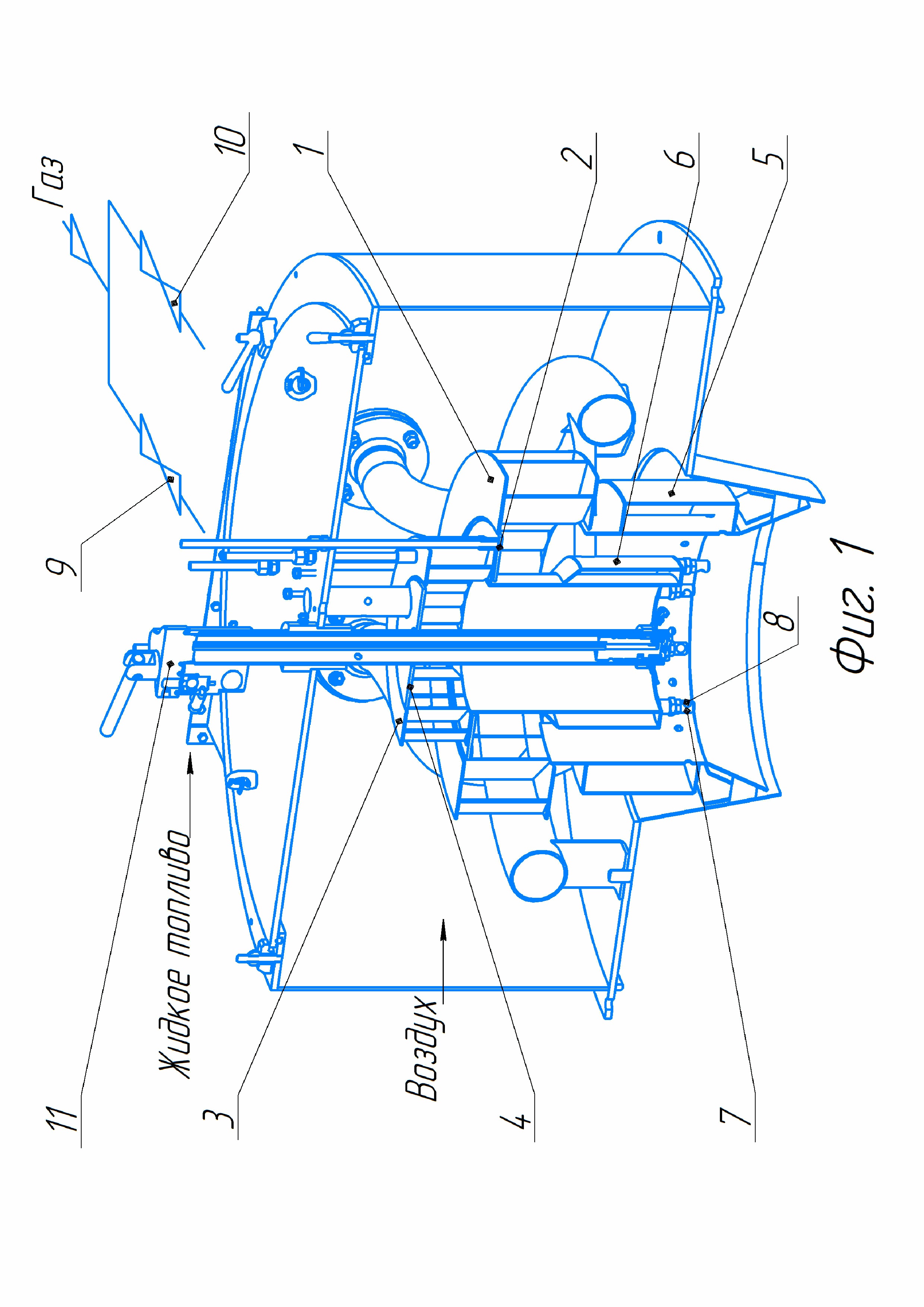 9 и 10 – клапана распределения расхода газа между периферийным и центральным газовыми коллекторами, 11 – паромеханическая форсунка для жидкого топлива.