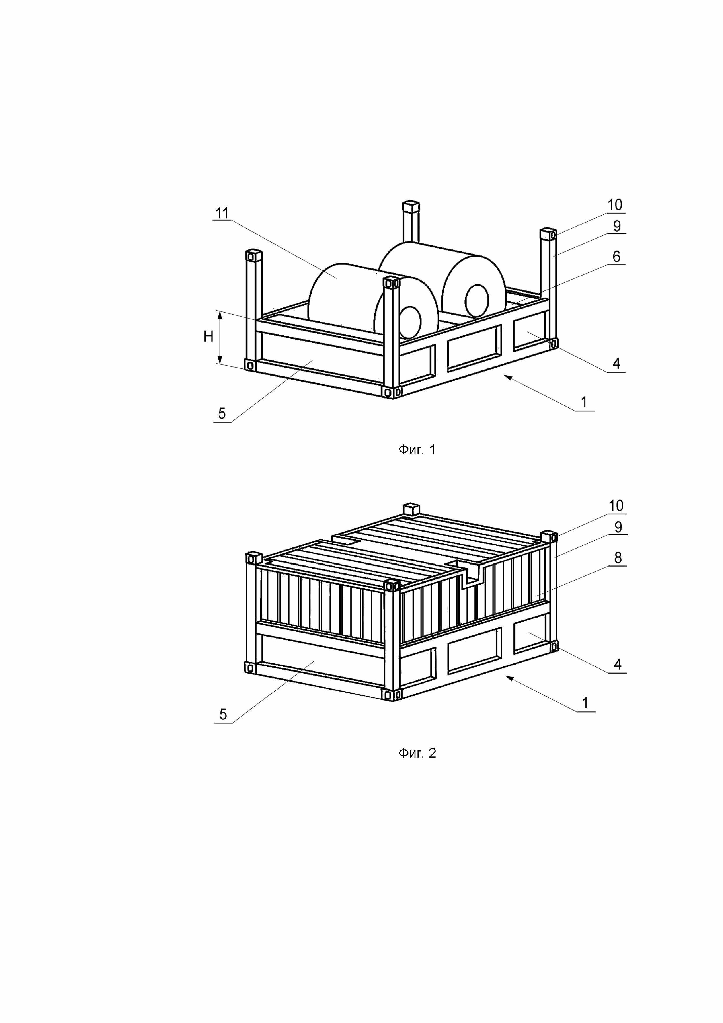 Контейнер для перевозки рулонов стали содержит прямоугольную раму, выполненную в виде балочного каркаса, включающего в себя продольные и поперечные балки в виде труб прямоугольного сечения, боковые и торцевые стенки, а также два ложемента в виде пары наклонных плоских пластин, соединенных усиливающими элементами с продольными балками каркаса. При этом контейнер снабжен съемной коробчатой крышкой, а высота угловых вертикальных балок каркаса увеличена на высоту коробчатой крышки. Техническим результатом является более рациональное использование фитинговой платформы с обеспечением защиты рулонов холоднокатаной стали от атмосферных осадков. 8 з.п. ф-лы, 3 ил.