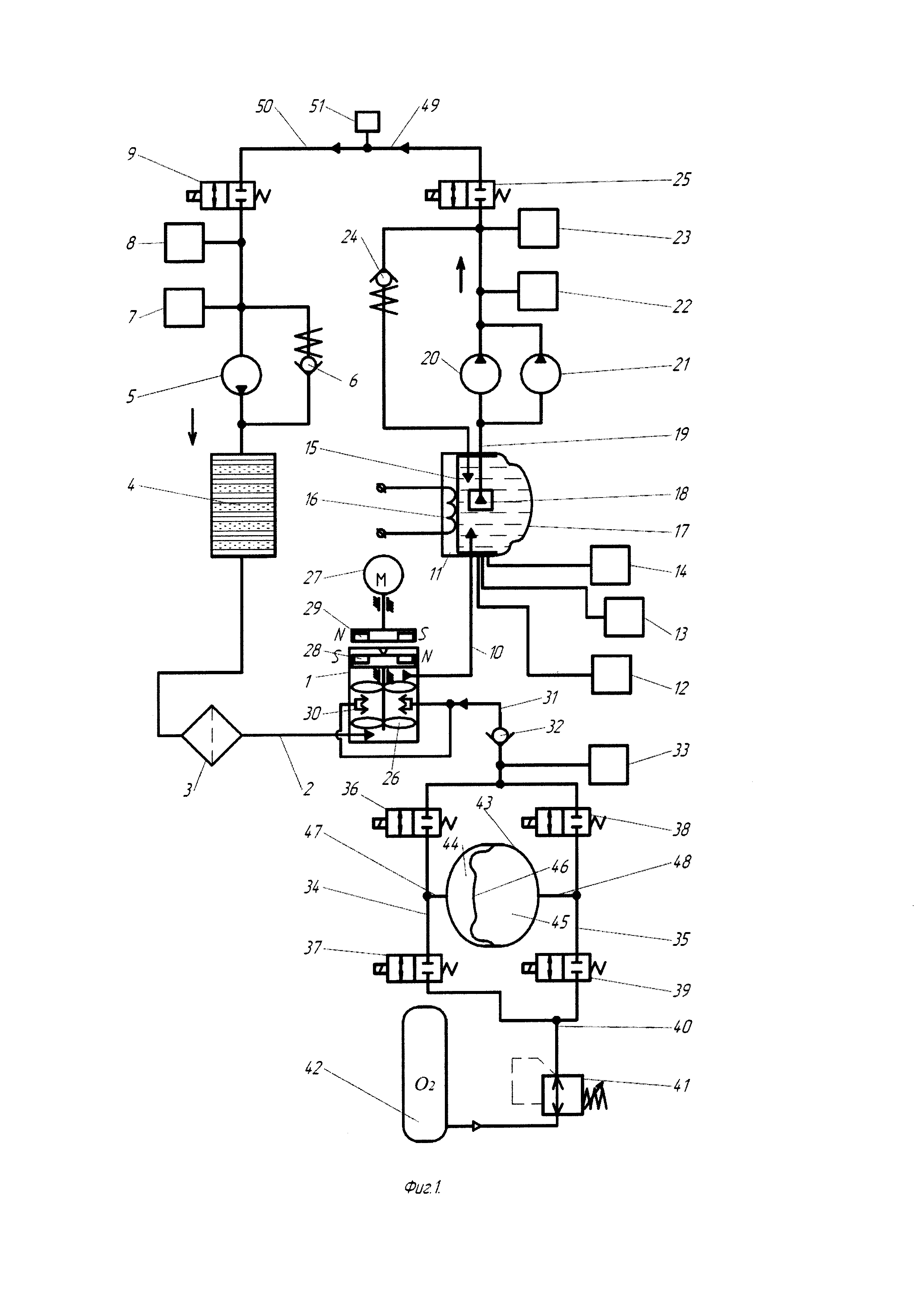 Полезная модель индивидуального аппарата жидкостного дыхания в условиях гипербарии замкнутого типа относится к медицинской технике, в частности к аппаратам и устройствам для осуществления искусственного жидкостного дыхания, и может найти применение в исследовательских целях и в лечебной практике, например, для осуществления дыхания человека в реанимационный период. Цель предлагаемого технического решения - расширение функциональных возможностей оборудования для жидкостного дыхания путем принудительной циркуляции через дыхательные органы биообъекта попутно насыщаемой кислородом дыхательной жидкости с требуемым давлением, расходом и объемом в условиях изменяющегося гипербарического давления окружающей газовой или жидкой среды и улучшение его эксплуатационных характеристик, в частности, увеличение времени непрерывной автономной работы без подзарядки или замены источника кислорода в виде баллона. Технический результат достигается путем выполнения системы циркуляции дыхательной жидкости замкнутой, содержащей линии вдоха и выдоха, с постоянным контролем параметров находящейся в них дыхательной жидкости - давления, расхода и температуры, определяющих работу входящих в состав системы функциональных элементов - электромагнитных распределителей, оксигенатора со смесителем, насосов, дозатора кислорода. Цикличность работы дозатора не зависит от цикличности работы насосов линий вдоха и выдоха, а устанавливается в зависимости от количества растворенного кислорода в находящейся в дыхательной камере жидкости, определяемого с помощью датчика кислорода, т.е. показания датчика влияют на количество подаваемого дозатором в оксигенатор кислорода, позволяя поддерживать заданное содержание кислорода в дыхательной жидкости и исключить его избыточность и необходимость сброса в окружающую среду, т.е. перерасход.
