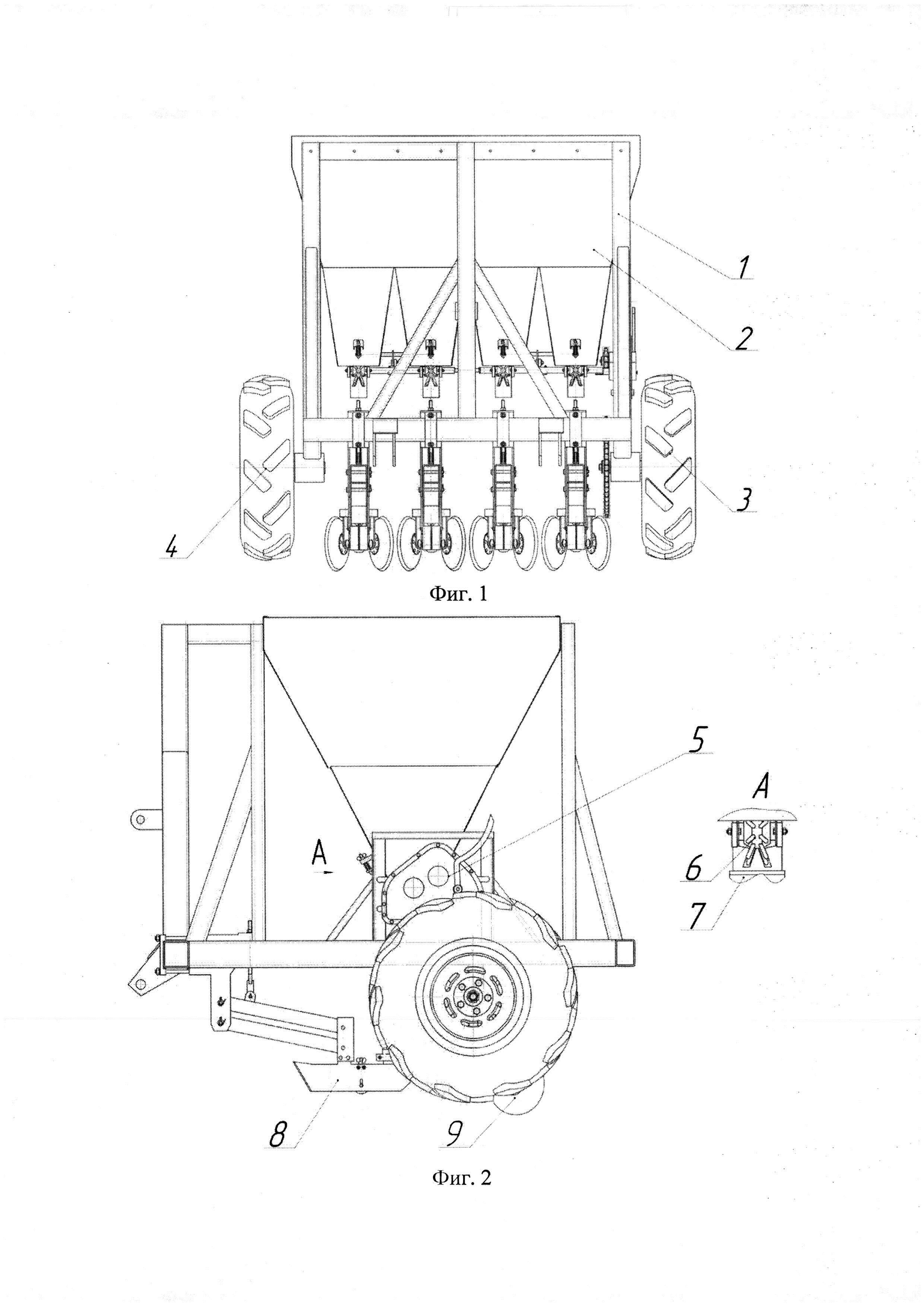 Полезная модель относится к области сельскохозяйственного машиностроения, в частности к сажалкам для посадки материалов с низкой сыпучестью, точнее лука-севка при его посадке. Известны сеялки для высева семян лука-севка с катушечными высевающими аппаратами, например, СЛН-6 и СЛС-8, состоящие из семенного ящика с катушечными высевающими аппаратами, семяпроводов и сошников с прикатывающими катками. В этих сеялках лук-севок выносится из семенного ящика лопастями катушек не по одному, а порциями по несколько штук и через семяпроводы выбрасывается в борозды, образованные сошниками. Неравномерная раскладка лука-севка снижает урожайность и товарный выход лука. Недостаток устройства - подача луковиц лука-севка порционно, а не поштучно. Известна сеялка лука-сева (а.с. СССР №174873 МПК А01, Бюл. №18, 1965 г.), включающая бункер, высевающие катушечные аппараты с муфтой, одетой на свободно вращающийся валик с поджимающей ее пружиной, семяпроводы, полозовидные сошники и маркеры. Недостатком известной сеялки для лука севка является порционная подача посевного материала. Известна машина для посадки лука-севка (а.с. СССР №1029860 МПК А01С 11/02, Бюл. №27, 1983 г.) которая включает бункер, ориентирующее устройство, выполненное в виде колеблющегося лотка, высаживающего устройства, выполненного в виде пневматических секционных шин. К недостаткам данной машины для посадки лука-севка следует отнести его низкую производительность и высокую энергоемкость, обусловленную применением вентилятора для создания разрежения в пневматических секционных шинах. Известна сеялка для высева семян лука-сева (а.с. СССР №261001 МПК А01С 7/16, Бюл. №4, 1970 г.), включающая бункер с ворошилками, а под выходным окном бункера установлен закрытый подающий шнек с увеличивающим шагом к выходному концу, который расположен над цепным транспортером с захватами. Сеялка работает следующим образом, семена лука-севка из бункера подаются ворошилкой через выходное окно в шнек, который транспортирует их к выходному концу, где они благодаря увеличивающемуся шагу витков шнека рассосредотачиваются в один ряд, а затем сталкиваются на захваты цепного транспортера, который уносит их в посадочную борозду. Недостатком данной сеялки является то, что при перемещении посадочного материала шнеком, возможно, его повреждение, что приводит к неравномерности всходов и снижению урожайности. Предлагаемая полезная модель направлена на устранение выше отмеченных недостатков, улучшение качества заделки луковиц и улучшение равномерности истечения семенного материала, подаваемого к высевающим аппаратам. Известна сажалка лука-сева (Патент РФ №204165, МПК А01С 7/00, Бюл. №14 от 13.05.2021 г.) которая включает из раму, бункер, приводные колеса, цепной, катушечно-вильчатые высаживающие аппараты, со сменными звездочками (Z4=17, Z5=20), семяпровод, полозовидные сошники и заделывающие устройства. При движении сажалки лук-севок захватывается поштучно и подается катушечно-вильчатым аппаратом в семяпровод, соединенный с полозовидным сошником. Полозовидный сошник образует посадочную борозду, куда укладываются луковицы поштучно с последующей их заделкой почвой заделывающими органами. К недостаткам данной сажалки лука-севка следует отнести способ регулирования нормы посадки влияющего на увеличение времени на замену звездочек при пере