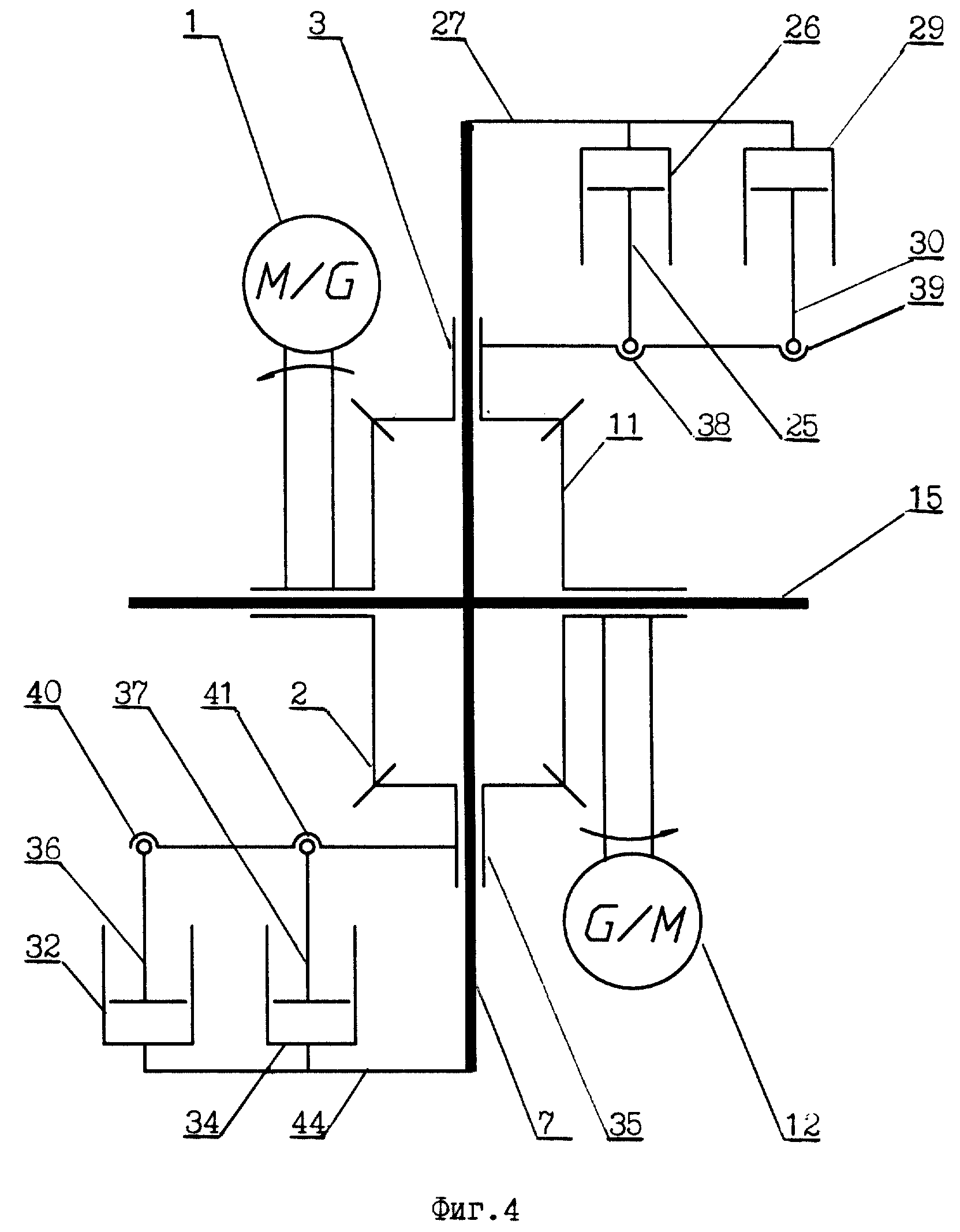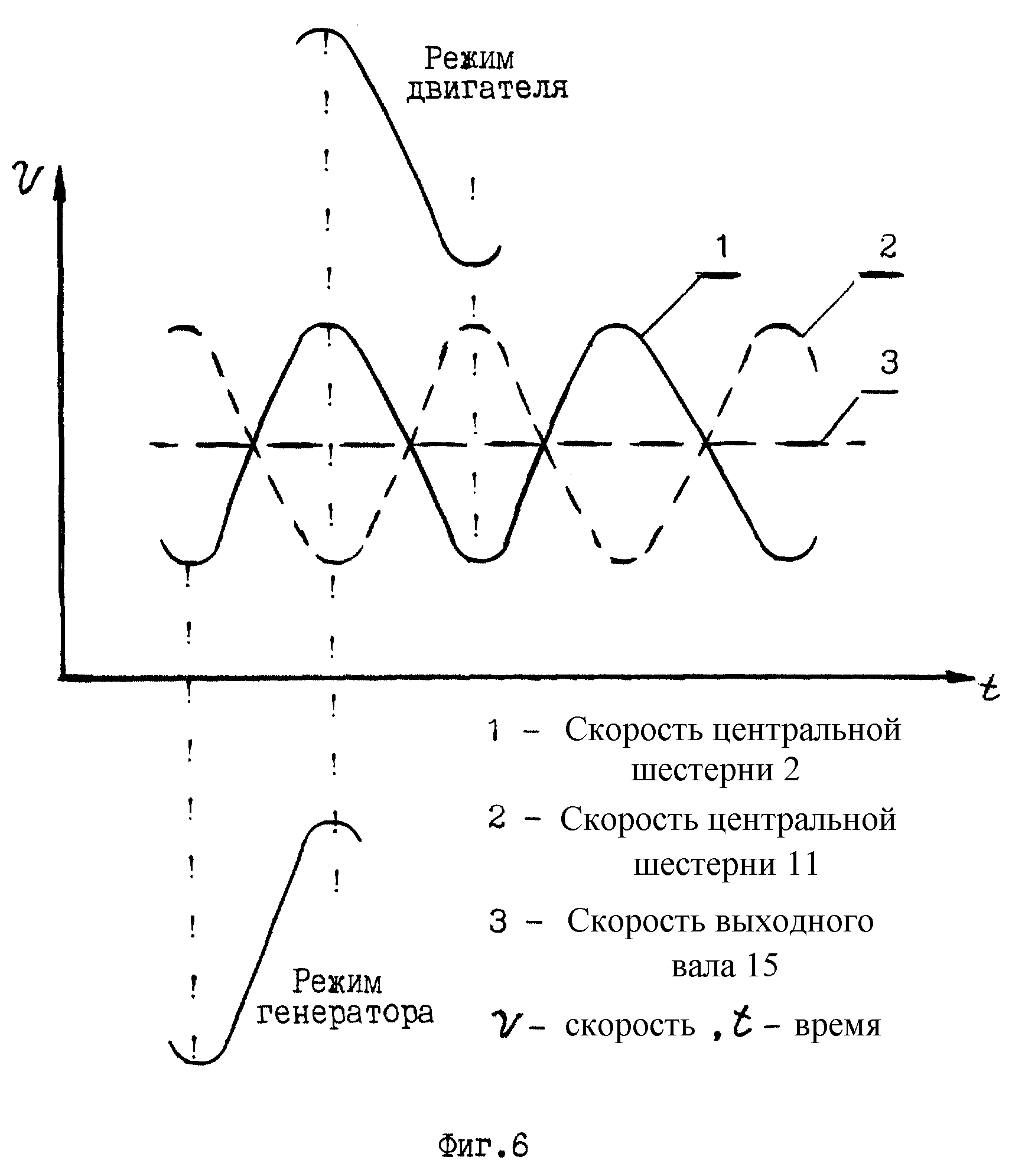 Приводя во вращение одну из электрических машин (например, электрическую машину 1 - режим электродвигателя), его якорь заставляет вращаться центральную шестерню 2, которая вращает сателлиты 3 и 35 в разные стороны. Сателлиты 3, 35 приводят в движение штоки 25, 30, 36, 37, которые соединены с поршнями цилиндров 26, 29 и 32, 34, тем самым распределяя такты по всем четырем цилиндрам 26, 29 и 32, 34. Таким образом, реализуются такты: "выхлоп", "всасывание", "сжатие" и "рабочий ход". Синхронно с этой последовательностью, согласно временной циклограмме, поступают управляющие команды из блоков 8, 22 управления цикловых операций в топливно-подготовительные блоки 4, 10 и 20, 24, управляя работой всасывающих и выхлопных клапанов, смешивая топливо с воздухом и подавая в цилиндр в нужной пропорции. Одновременно с началом вращения электрической машины 1, через дифференциальный механизм (центральная шестерня 11), начинает вращаться электрическая машина 12. При этом происходит реакция торможения якоря электрической машины 12, замедляется вращение центральной шестерни 11 и, следовательно, повышается степень сжатия в блоках цилиндров, в результате чего происходит воспламенение рабочей смеси в одном из цилиндров (такт "рабочий ход"), газы, расширяясь, толкают поршень в направлении вращения электрической машины 1. Центральная шестерня 11 ускоряет свое вращение, обгоняя центральную шестерню 2, у которой происходит замедление скорости вращения. Таким образом, в данный отрезок времени электрическая машина 12 работает в режиме генератора, а электрическая машина 1 в режиме двигателя. Наступает процесс сжатия горючей смеси в очередном цилиндре, воспламенение, рабочий ход, и теперь уже электрическая машина 1 в режиме генератора, а следовательно, и центральная шестерня 2 обгоняет по скорости вращения центральную шестерню 11, электрическая машина 12 выполняет роль двигателя. Таким образом происходит повторение указанных выше последовательностей работы роторно-поршневого двигателя. А так как сателлиты 3 и 35 при работе поршневой системы делают колебательные движения, попеременно перемещаясь по окружности центральных шестерен 2 и 11, то водило 7, а следовательно, и выходной вал 15, подключенный к полезной нагрузке, получают постоянный вращающий момент. На фиг. 6 показаны относительные скорости центральных шестерен 2 и 11 и выходного вала 15.