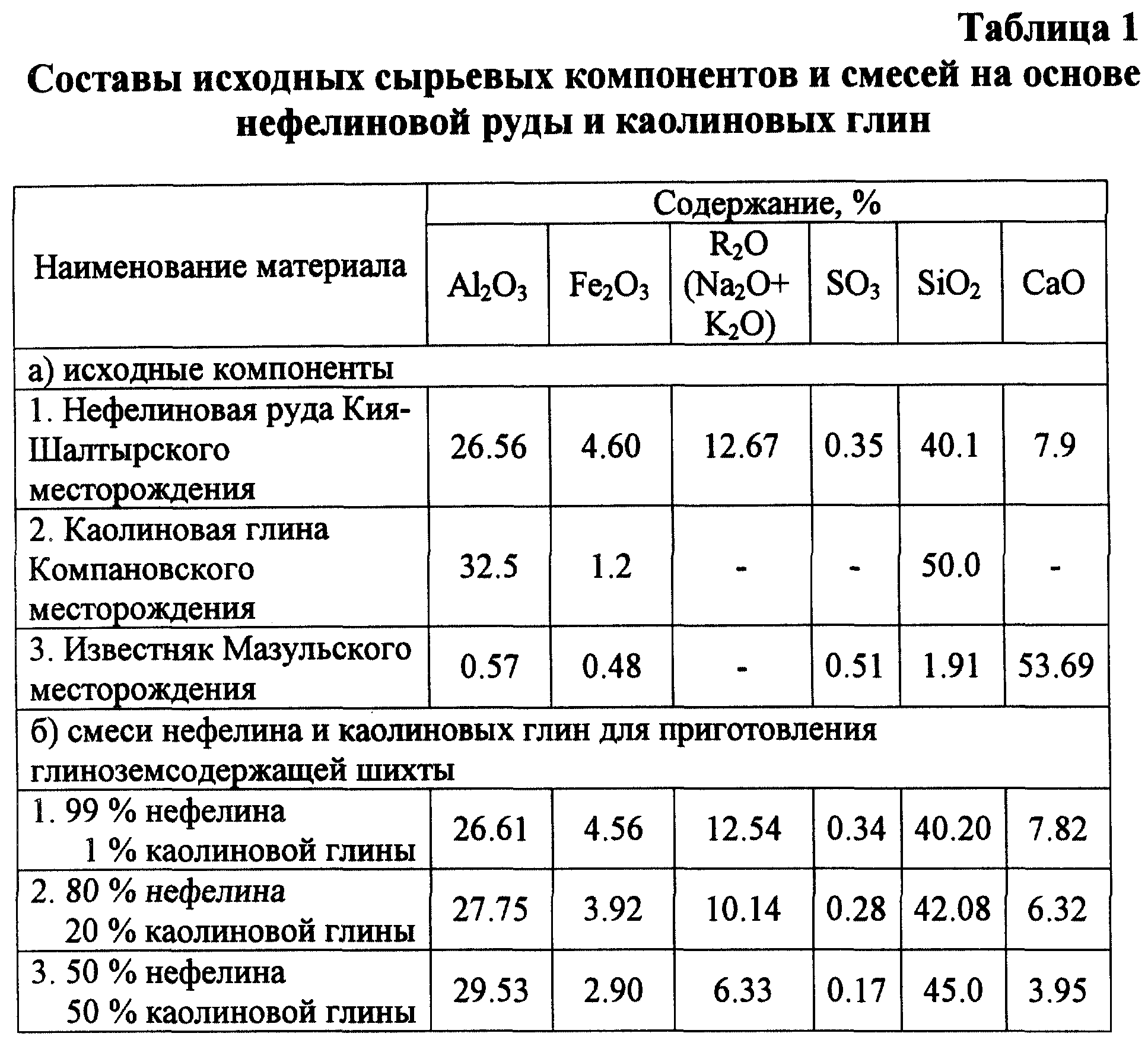 технических решений в данной области техники. В таблице 1 приведены составы исходных сырьевых компонентов и результаты расчета сырьевых смесей на основе нефелиновой руды