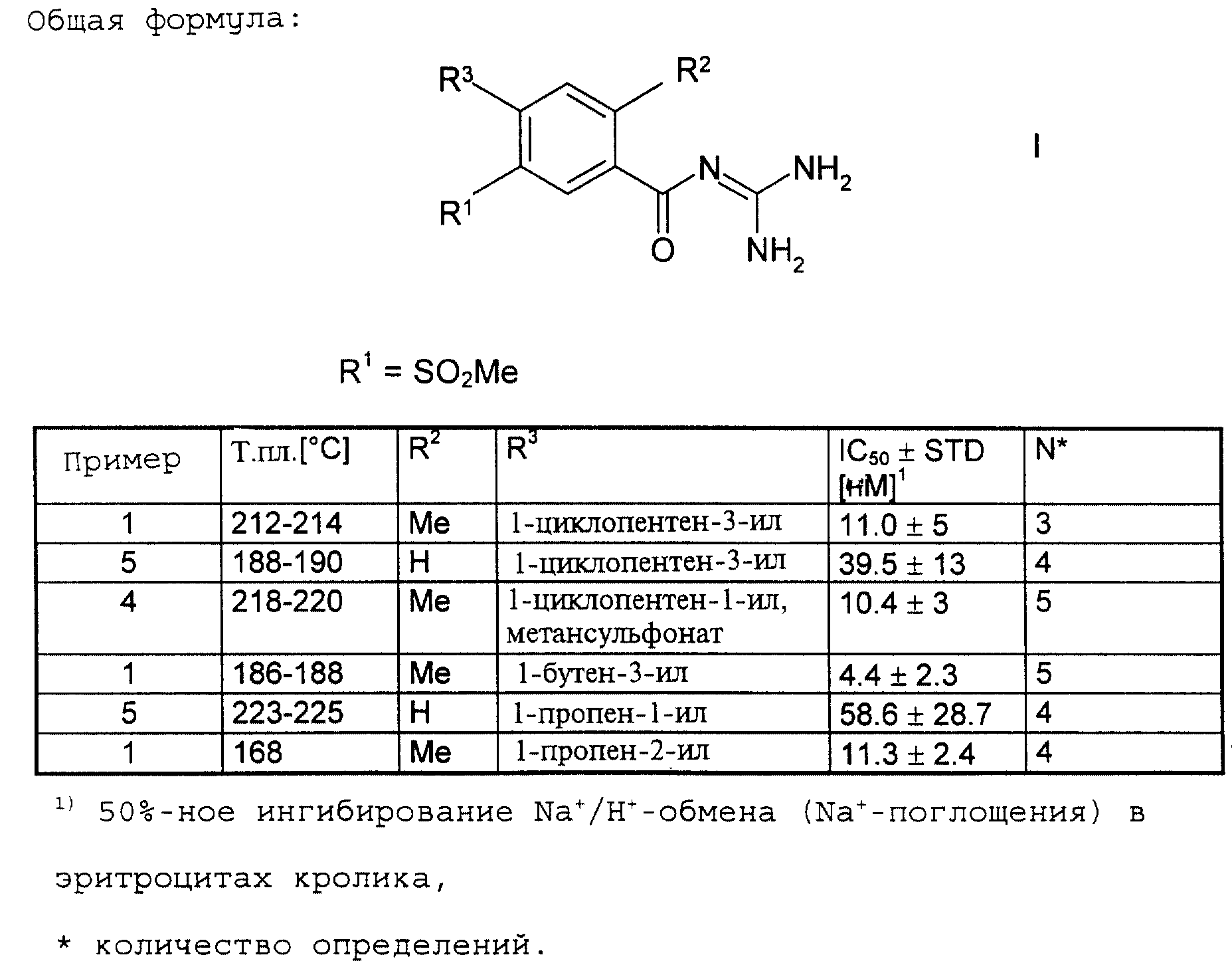 их физиологически не вызывающие опасений соли при хорошей переносимости имеют ценные фармацевтические свойства. В случае новых соединений речь идет об ингибиторах клеточного Na+/H+-антиносителя, т.е. об активных веществах, которые тормозят Na+/H+-механизм обмена клеток [Dusing et al., Med. Klin, 87, 378-384 (1992)] и представляют,