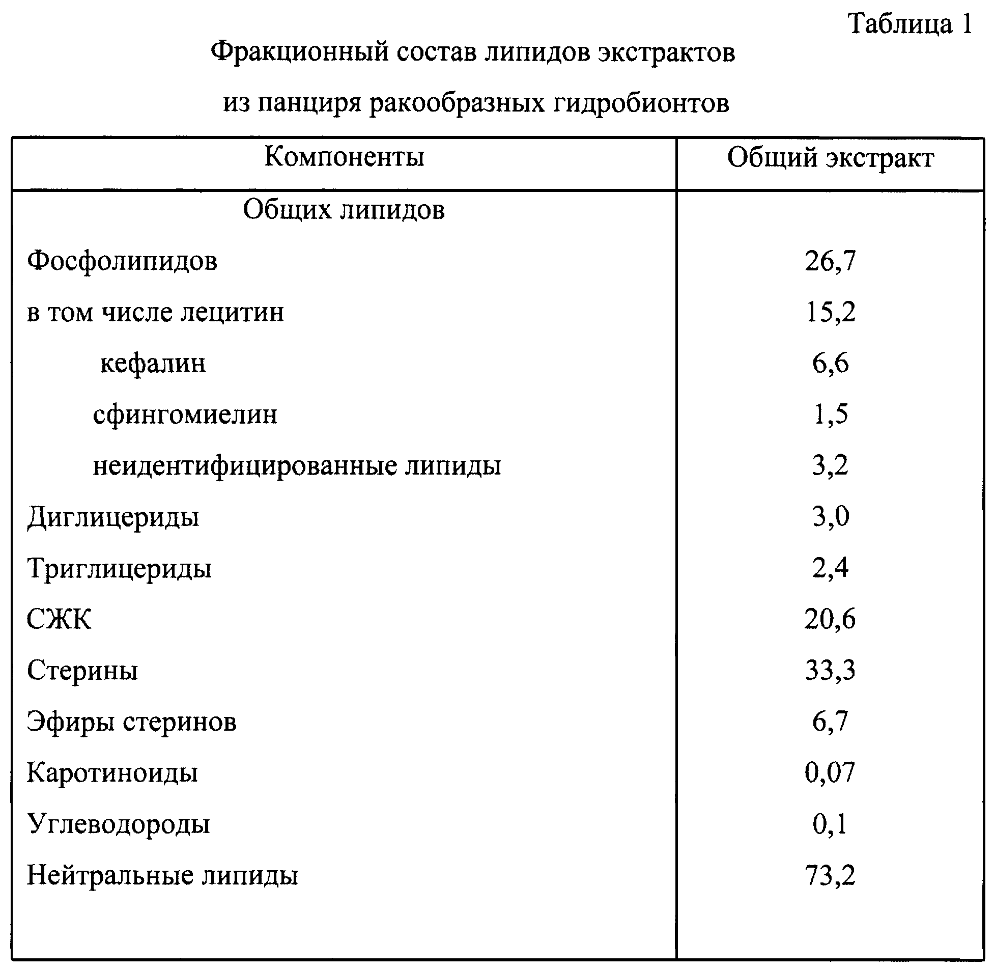 панциря краба показана в табл. 2. Концентрат каротиноидов и концентрат фосфолипидов из этих гидробинтов представляют собой композиции ценных БАВ и в настоящее