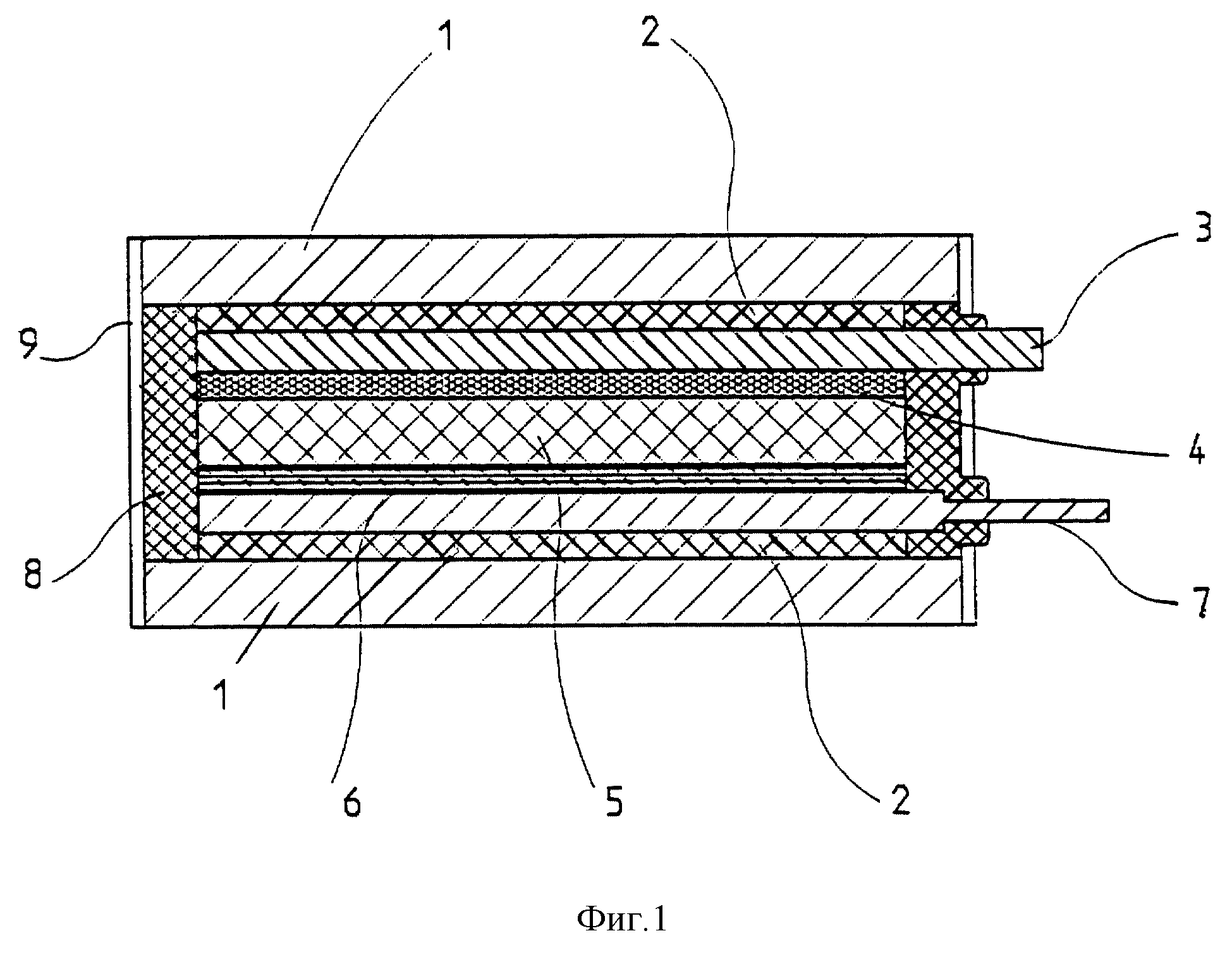 графитовой фольги; 5 - отрицательный поляризуемый углеродный пористый электрод; 6 - электрононепроводящий сепаратор; 7 - положительный электрод;