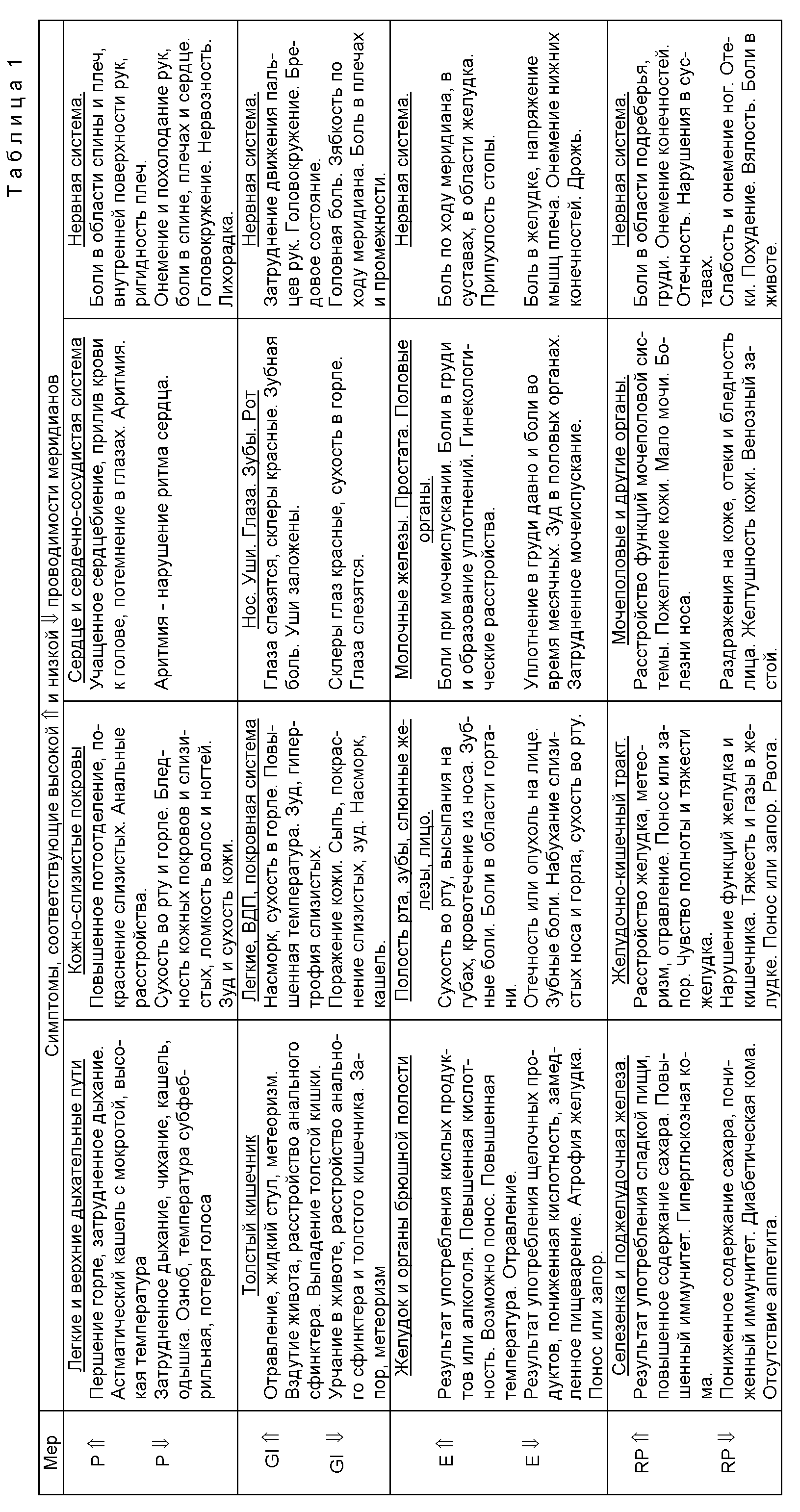 Поставленная задача решается тем, что в известном способе электропунктурной диагностики, включающем воздействие электрическим током не более 10 мкА на акупунктурные биологически активные точки (БАТ) 12 парных меридианов с одновременным измерением электропроводимости кожного покрова в репрезентативных точках, регистрацию результатов измерений и определение абсолютных разностей значений электропроводимости между последующим и предыдущим меридианами по часовому циклу активности, воздействуют электрическим током отрицательной полярности в течение не менее 3 с на человека и дополнительно определяют разность между электропроводимостью правых и левых меридианов, среднюю электропроводимость всех меридианов, среднюю абсолютную разность электропроводимостей двенадцати меридианов, среднюю абсолютную разность между электропроводимостью левых и правых меридианов, величину физиологического коридора нормы как сумму последних двух разностей, и величину физиологического коридора риска как удвоенную величину коридора нормы, относительную возбужденность меридиана как отношение абсолютной разности его электропроводимостей к среднему значению абсолютных разностей электропроводимостей всех меридианов, после чего определяют состояние меридиана по сопоставлению электропроводимости меридиана с коридором нормы и относительной возбужденности меридиана, причем, если