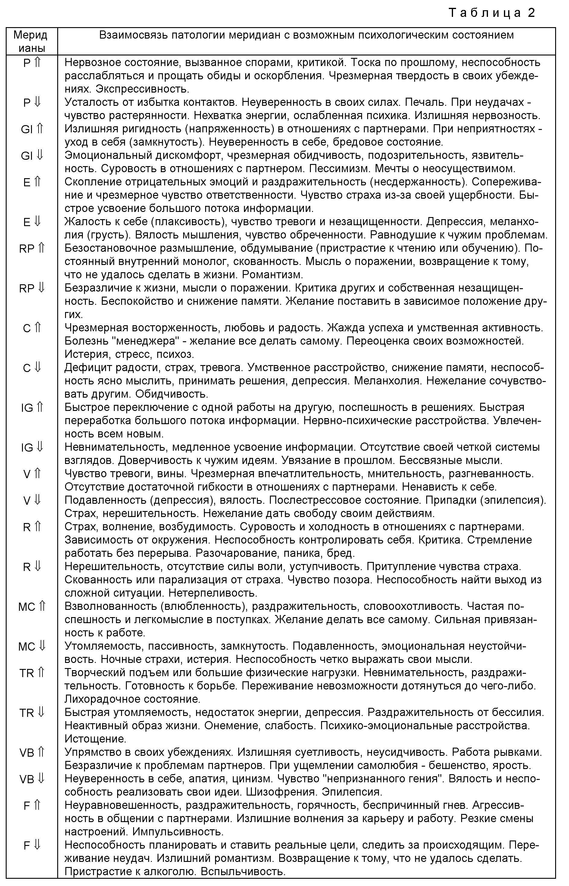Изобретение относится к медицине, рефлексодиагностике и может быть использовано для диагностики физиологического и психологического состояния. Воздействуют на биологически активные точки (БАТ) двенадцати парных меридианов с одновременным измерением электропроводимости кожи. Для этого воздействуют на БАТ электрическим током отрицательной полярности в течение не менее 3 с. Величина тока не более 10 мкА. По полученным величинам электропроводимостей БАТ рассчитывают состояние меридианов. По совокупности состояний меридианов определяют общее состояние, формы патологии, психологический тип. Способ повышает результативность диагностики. 1 ил., 8 табл.