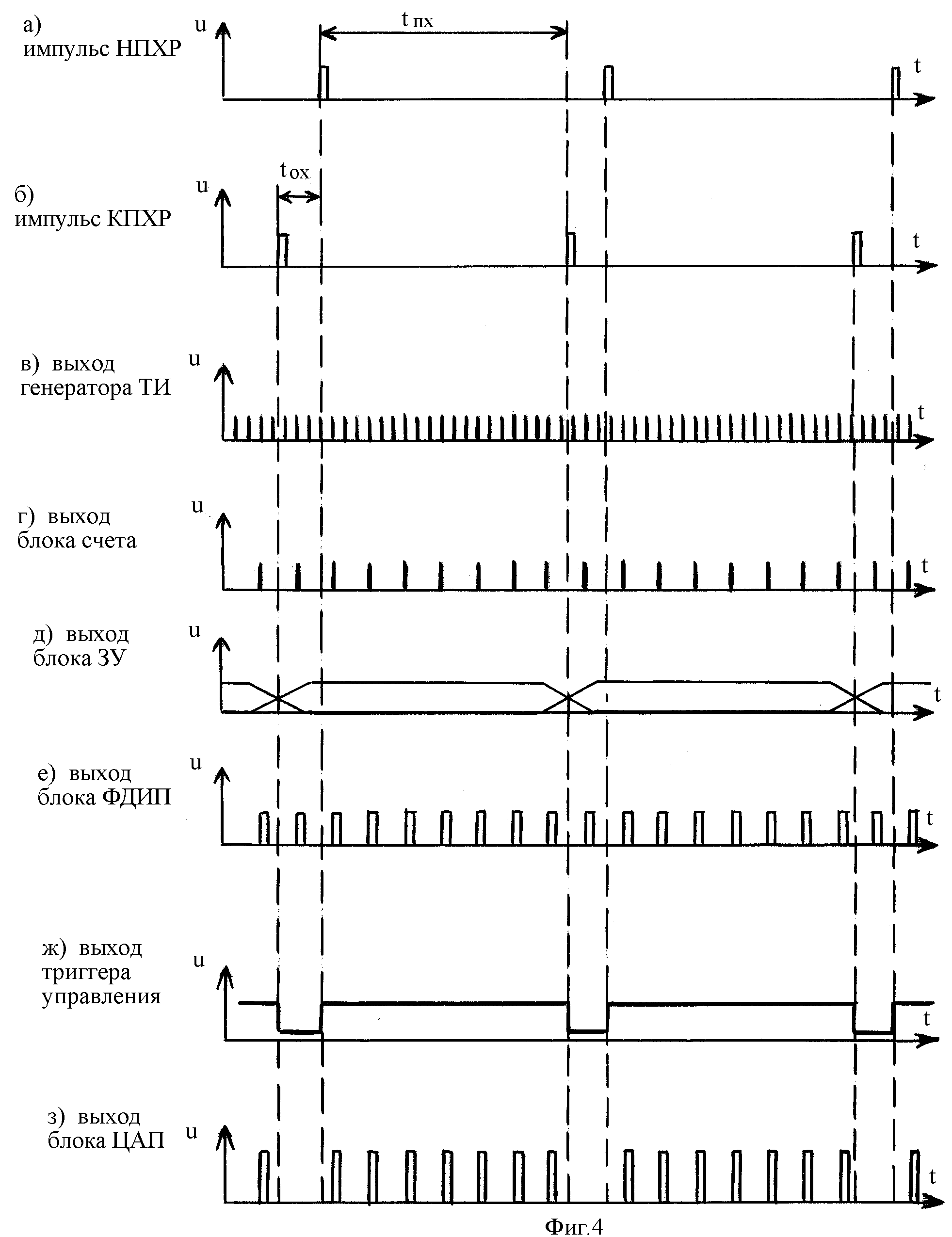 генератора 6 синхросигналов формируется импульс конца прямого хода развертки (импульс КПХР) (фиг.4 поз.б). Время между импульсом НПХР и импульсом КПХР (tпх), а также время между импульсом
