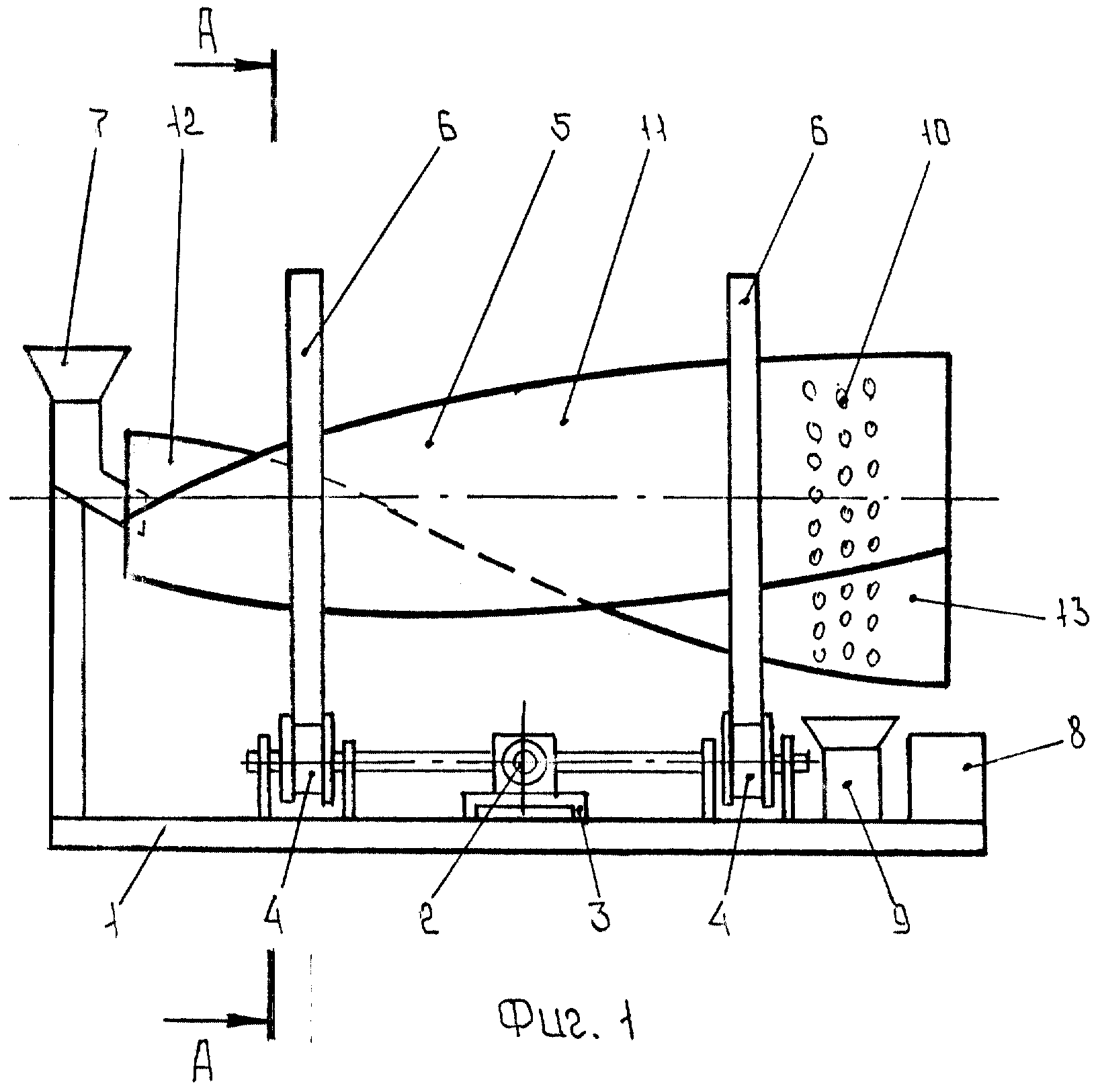 Галтовочный барабан 5 снабжен двумя ободами 6, которые опираются на роликовые опоры 4. На станине 1 смонтировано средство для загрузки 7 и разгрузки 8, а также бункер 9 для отходов (облой, металл