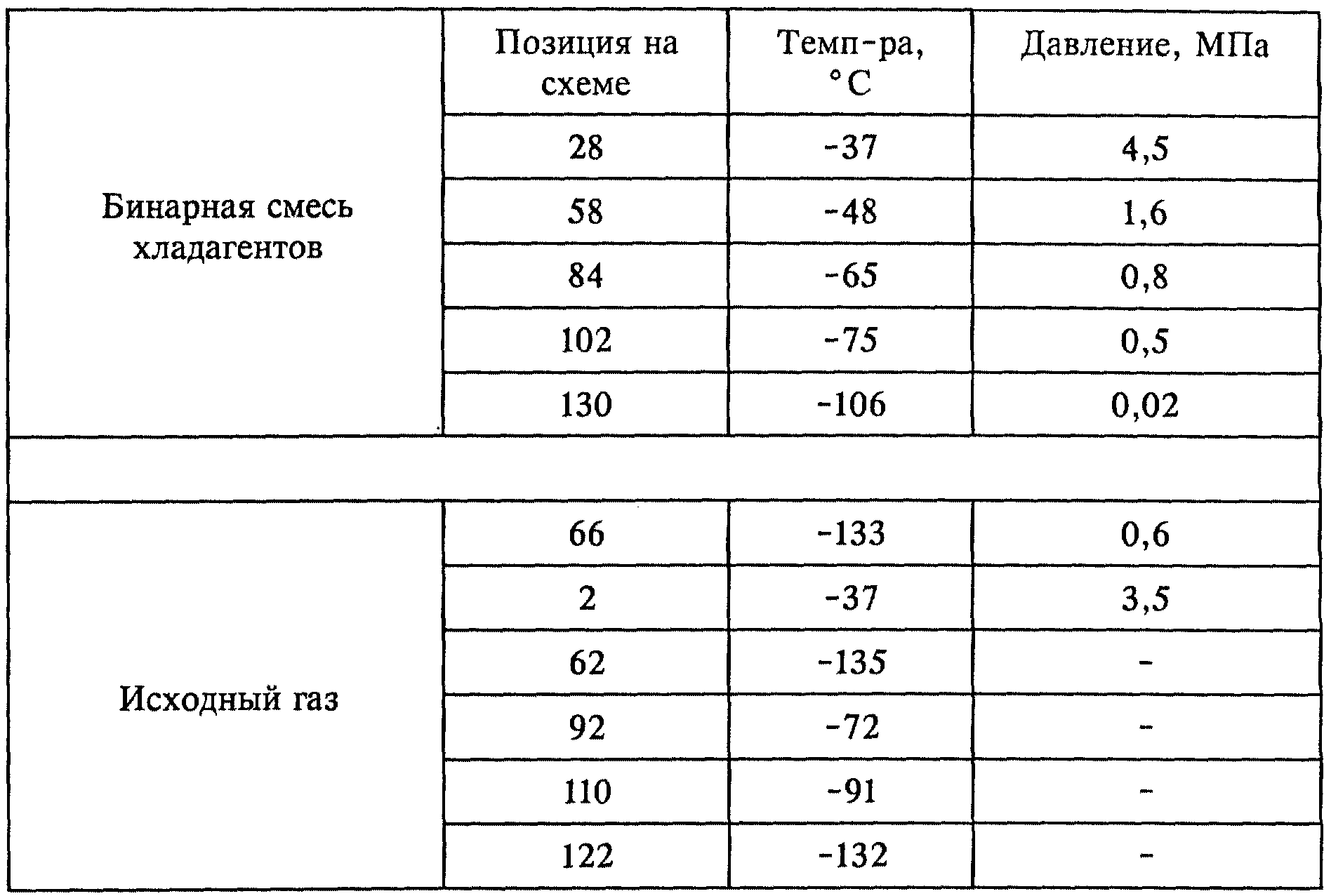 Поток 106 бинарной смеси хладагентов поступает во всасывающий барабан 130, а из него - в предназначенный для сжатия паров 132 бинарной смеси хладагентов компрессор 18. Реально установка для получения этилена вместо 4-х показанных на фиг.1 теплообменников 4, 6, 8 и 10 может иметь и другое количество теплообменников, которое зависит от конкретной потребности в них и определяется особенностями технологического процесса получения этилена, в частности составом исходного газа, из которого получают этилен. В приведенной ниже таблице указаны значения температуры и давления бинарной смеси хладагентов и исходного газа (обрабатываемого газа), включая систему деметанизации, в различных точках технологической линии, конкретный пример которой показан на приведенной на фиг.1 схеме.