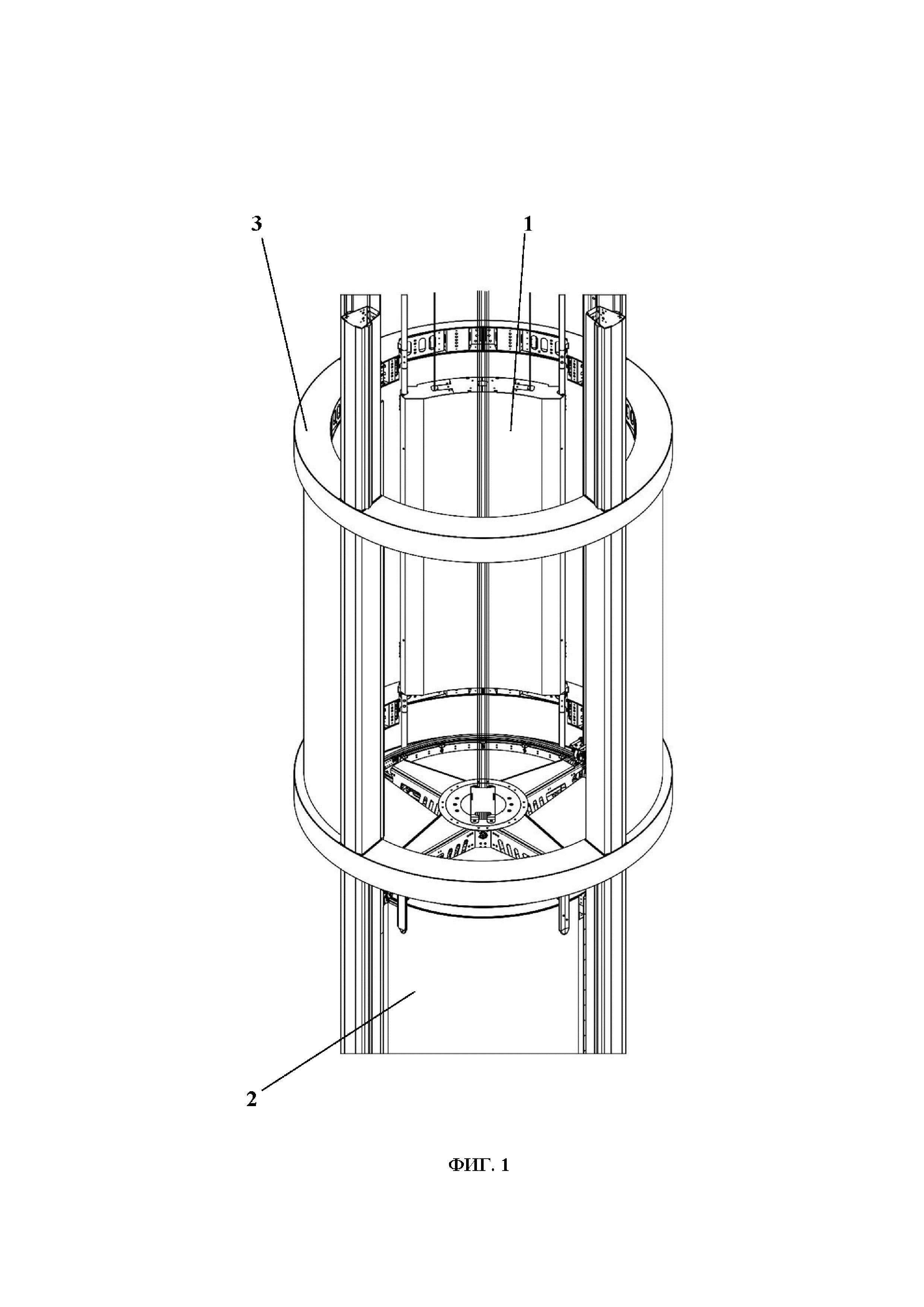 1. Противовес лифта цилиндрической формы, предназначенный для размещения между кабиной лифта цилиндрической формы и шахтой с формой, близкой к цилиндрической, отличающийся тем, что противовес выполнен в виде объемной фигуры, имеющей две продольные наружные стенки и две продольные торцевые стенки, продольные наружные стенки ориентированы вертикально вдоль кабины лифта и шахты, при этом боковые продольные наружные стенки противовеса выполнены в поперечном сечении дугообразными с образованием двух концентрических дуг для обеспечения возможности размещения противовеса между кабиной лифта и шахтой. 2. Противовес по п. 1, отличающийся тем, что центральные оси окружностей, огибающих продольные наружные стенки противовеса, и центральная продольная ось кабины лифта в плане совпадают друг с другом.