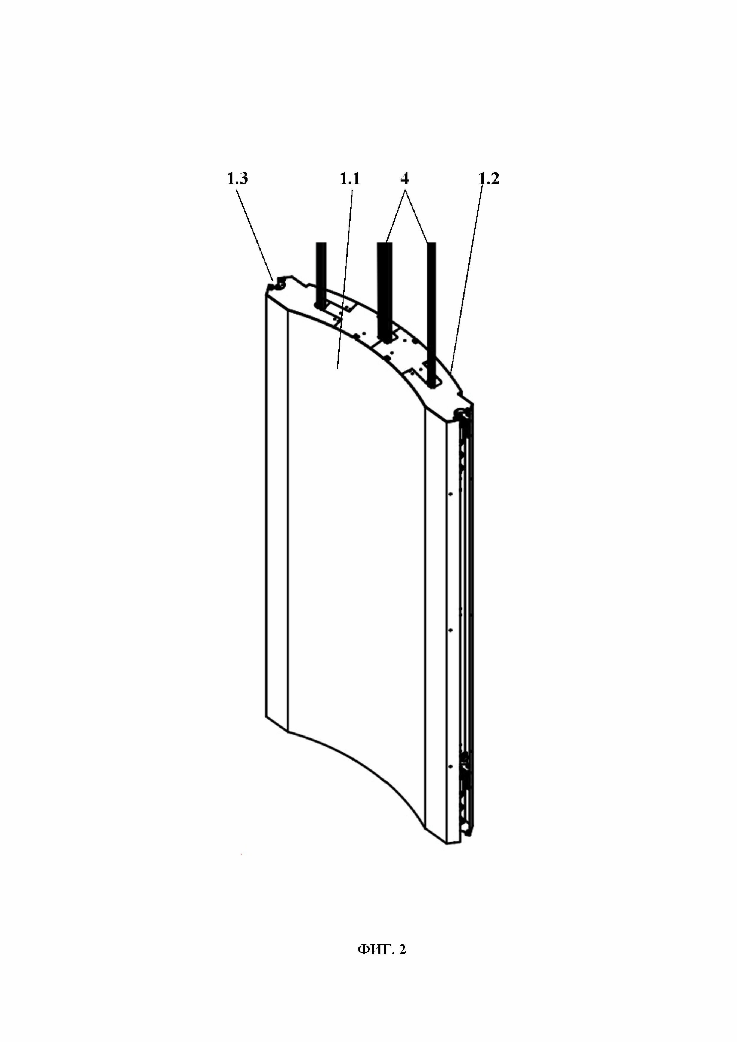 Полезная модель относится к лифтовой системе, в частности к лифтовой системе, содержащей противовес для управления лифтовой кабиной лифта цилиндрической формы. Из патента РФ № 2432313 на изобретение известен лифт, содержащий кабину (11) и противовес (12) в шахте (10) и приводную машину (20), которая приводит в движение через, по меньшей мере, две ведущие зоны (3, 3') кабину (11) и противовес (12), при этом приводная машина (20) содержит приводной вал (4), по меньшей мере, две расположенные на расстоянии друг от друга ведущие зоны (3, 3') и узлы, такие как двигатель (1) и тормоз (2), причем несущие и ведущие средства (19, 19') расположены в соответствии с расстоянием между ведущими зонами (3, 3'), при этом ведущие зоны (3, 3') интегрированы за одно целое в приводной вал (4) и выполнены непосредственно в нем, причем расстояние (D) между двумя ведущими зонами (3, 3'), соответственно, несущими и ведущими средствами (19, 19') соответствует максимально трехкратной ширине подошвы направляющего рельса (1.3) кабины. Из описания указанного патента известно, что шахта лифта может быть выполнена круглой формы, при этом противовес в поперечном сечении имеет прямоугольную форму. Из патента РФ № 2749216 известна лифтовая шахта для лифта цилиндрической формы с противовесом. Противовес размещен между кабиной и шахтой и имеет в поперечном сечении прямоугольную форму. Недостатком известных аналогов являются большие габариты шахты для размещения лифта. Лифты цилиндрической формы, как правило, используются как наружные в зданиях небольшой этажности. Поэтому габариты лифта имеют существенное значение для их размещения и последующей эксплуатации. Изобретение по патенту РФ № 2749216 выбрано в качестве наиболее близкого аналога. Техническая проблема, решаемая предлагаемой полезной моделью, - устранение недостатков аналогов. Технический результат, достигаемый полезной моделью, заключается у уменьшении габаритов лифта цилиндрической формы с противовесом. Технический результат достигается за счет того, что противовес лифта цилиндрической формы, предназначенный для размещения между кабиной лифта цилиндрической формы и шахтой с формой, близкой к цилиндрической, согласно полезной модели противовес выполнен в виде объемной фигуры, имеющей две продольные наружные стенки и две продольные торцевые стенки, продольные наружные стенки ориентированы вертикально вдоль кабины лифта и шахты, боковые продольные наружные стенки противовеса выполнены в поперечном сечении дугообразными с образованием двух концентрических дуг для обеспечения возможности размещения противовеса между кабиной лифта и шахтой. Центральные оси окружностей, огибающих продольные наружные стенки противовеса, и центральная продольная ось кабины лифта в плане могут совпадать друг с другом. Полезная модель поясняется фигурами. На фиг. 1 изображен вид на противовес, расположенный между кабиной лифта цилиндрической формы и шахтой. На фиг. 2 изображен противовес. Позиции на фигурах: 1 – противовес; 1.1 и 1.2 – продольные наружные стенки противовеса; 1.3 – продольные торцевые стенки противовеса; 2 – кабина лифта цилиндрической формы; 3 – шахта лифта; 4 – тросы. Противовес 1 лифта цилиндрической формы, предназначенный для размещения между кабиной 2 лифта цилиндрической формы и шахтой 3 с формой, близкой к цилиндрической, выполнен в виде об