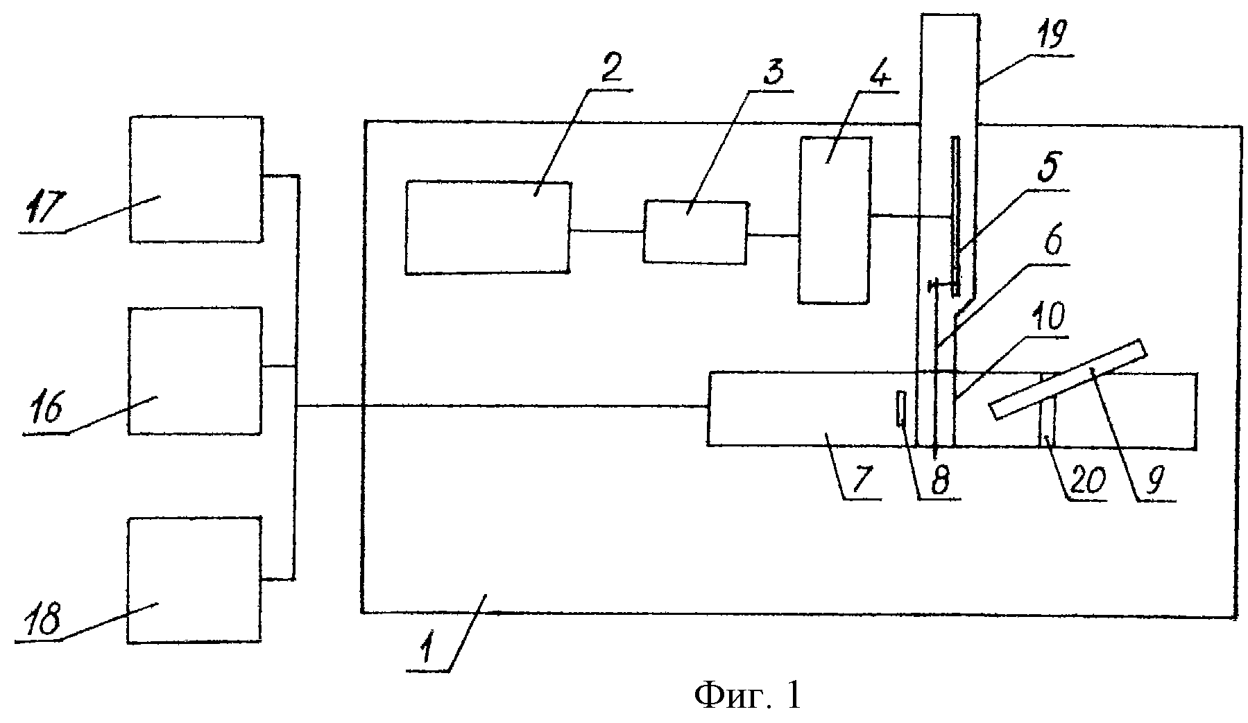 Для удобства ведения наблюдения (и съемки) и с позиций безопасности ножевой диск с ножом и зона резания укрыты съемным кожухом 19, выполненным из прозрачного материала. Для резания нескольких заготовок одновременно загрузочное устройство снабжено фиксатором 20 (например, хомутом).