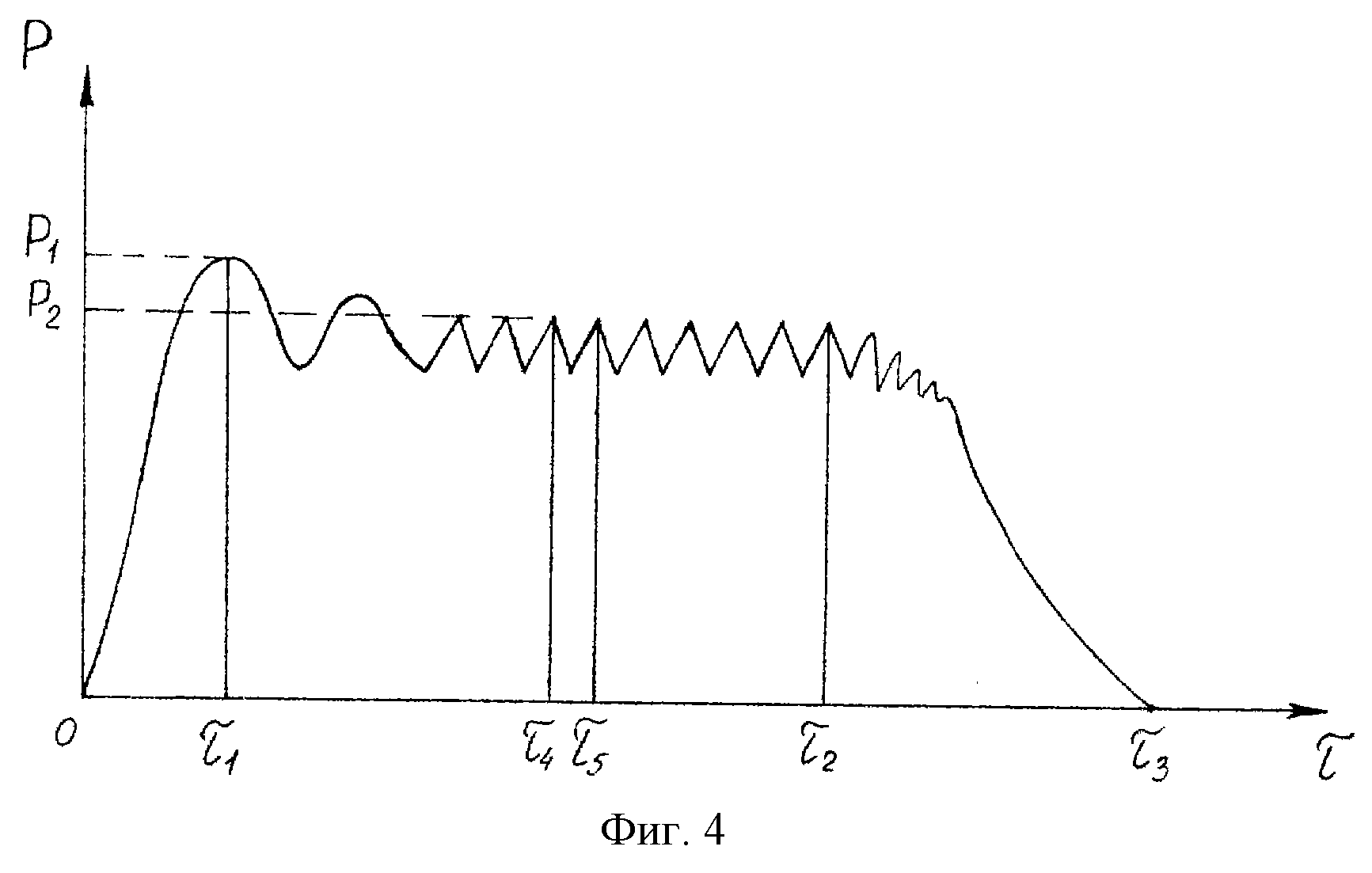 Затем варьируют настройку рубительной машины. Например, устройством 11 изменяют угол наклона α, сменой подставки 12 изменяют угол β, изменением положения упора 8 изменяют длину щепы, сменой ножа 6 изменяют геометрию заточки, средствами 2, 3, и 4 изменяют частоту вращения ножевого диска (скорость резания), сменой заготовки 13 изменяют породу (лиственница, береза) дерева и ее состояние (мерзлая, нормальная и т.д.). При этом регистрируют и анализируют график изменения силы резания (фиг.4), и сопоставляют полученные результаты. Стабильность щепкообразования (постоянные размеры щепы и меньшая степень повреждения щепы) сопровождается минимальным значением Р1 силы резания на участке 0-τ1 врезания, минимальным перепадом Р12 сил на участке О-τ1 врезания и участке τ12 установившегося резания, плавным спадом на участке τ23 выхода ножа из резания (период 0-τ3 соответствует времени одного реза).