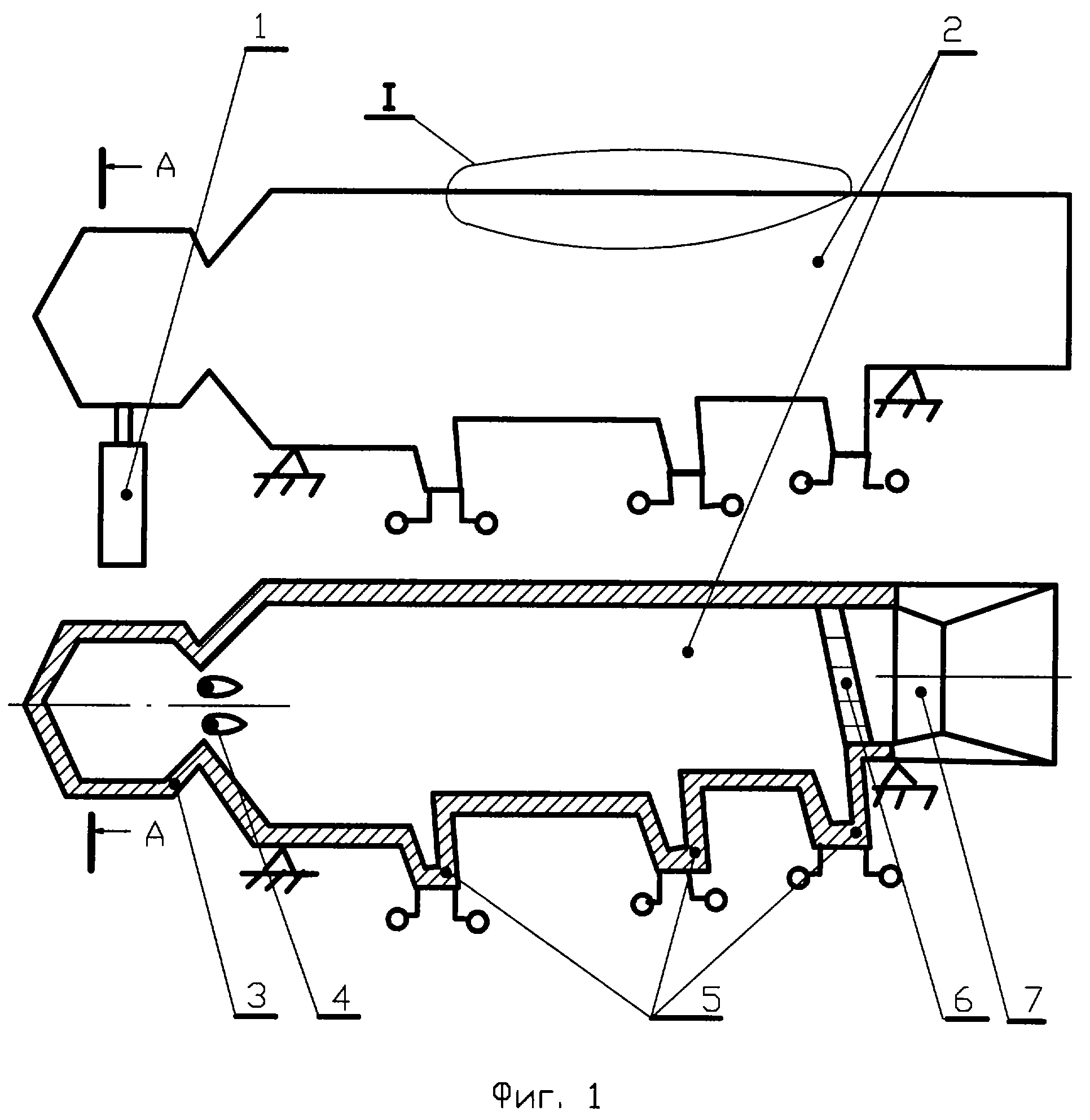 потребителя энергии теплотворной способности топлив и механической энергии детонационной волны. Это достигается тем, что топочное устройство представляет собой оболочку, в которой