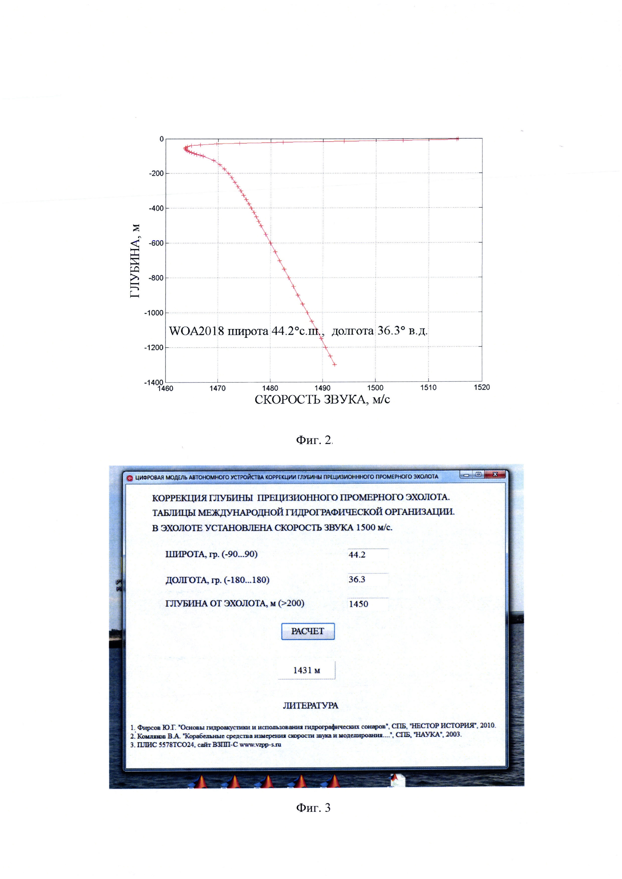 Автономное устройство коррекции глубины прецизионных промерных эхолотов, содержащее блоки интерфейса ввода и вывода, отличающееся тем, что в устройство введены блоки расчета номера района Мирового океана (МО), выборки из таблицы районов МО, таблица районов МО, расчета коррекции глубины, выборки из таблицы коррекции глубины, таблица коррекции глубины и алгебраического суммирования, при этом вход блока интерфейса ввода соединен с источником команд прецизионного промерного эхолота, а первый выход которого соединен с входом блока расчета номера района МО, выход которого соединен с первым входом блока выборки из таблицы районов МО, первый выход которого соединен с входом блока таблицы районов МО, выход которого соединен со вторым входом блока выборки из таблицы районов МО, второй выход которого соединен с первым входом блока расчета коррекции глубины, выход которого соединен с первым входом блока выборки из таблицы коррекции глубины, первый выход которого соединен с входом блока таблицы коррекции глубины, выход которого соединен со вторым входом блока выборки из таблицы коррекции глубины, второй выход которого соединен с первым входом блока алгебраического суммирования, второй вход которого соединены со вторым входом блока расчета коррекции глубины и вторым выходом блока интерфейса ввода, а выход блока алгебраического суммирования соединен с входом блока интерфейса вывода, а его выход соединен с источником команд прецизионного промерного эхолота.