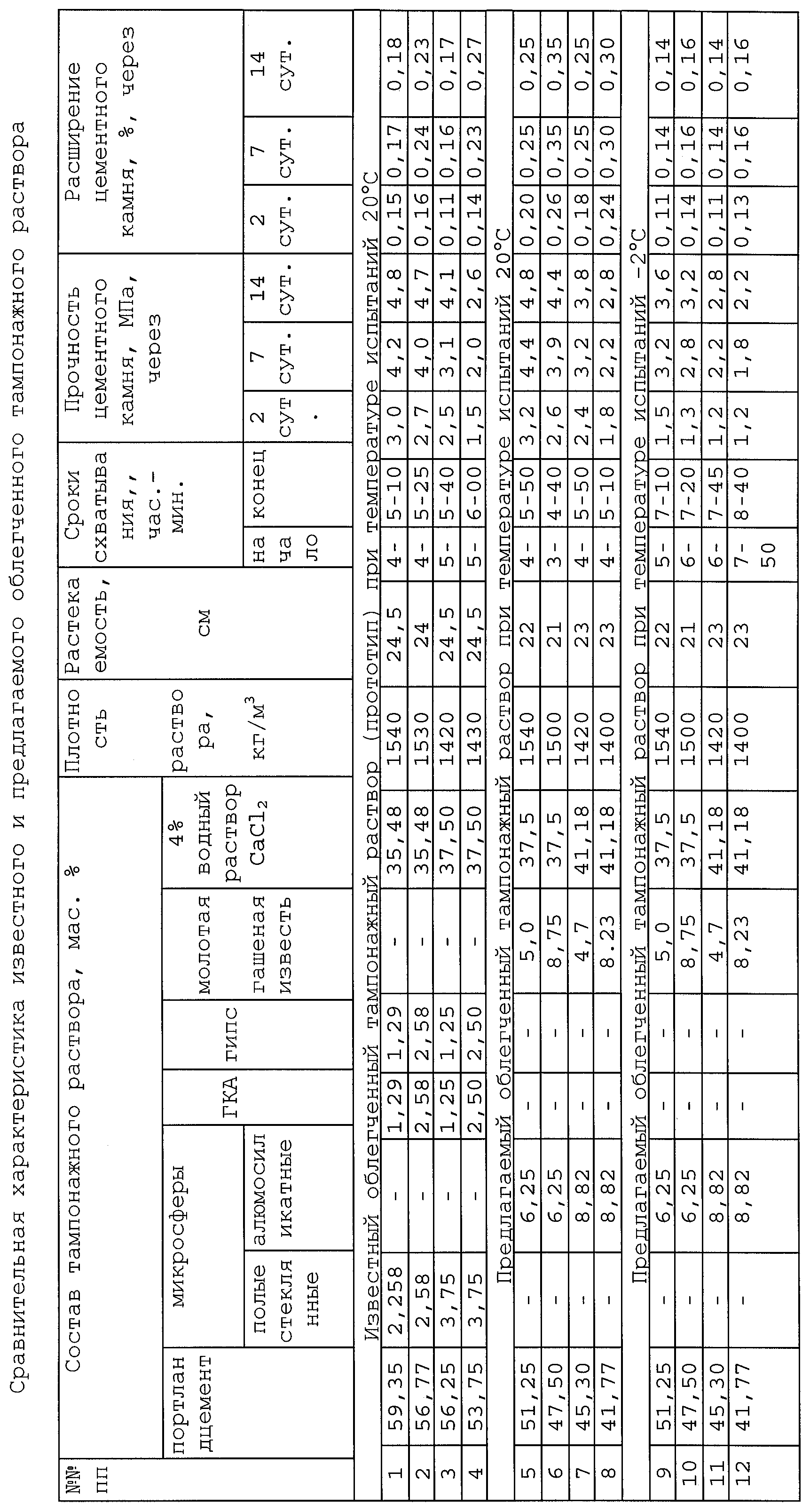 мас.%, тогда как у соизмеримых по плотности составов известного облегченного тампонажного раствора (прототип) расширение цементного камня через 7 суток твердения составляет 0,17-0,23% при заданной