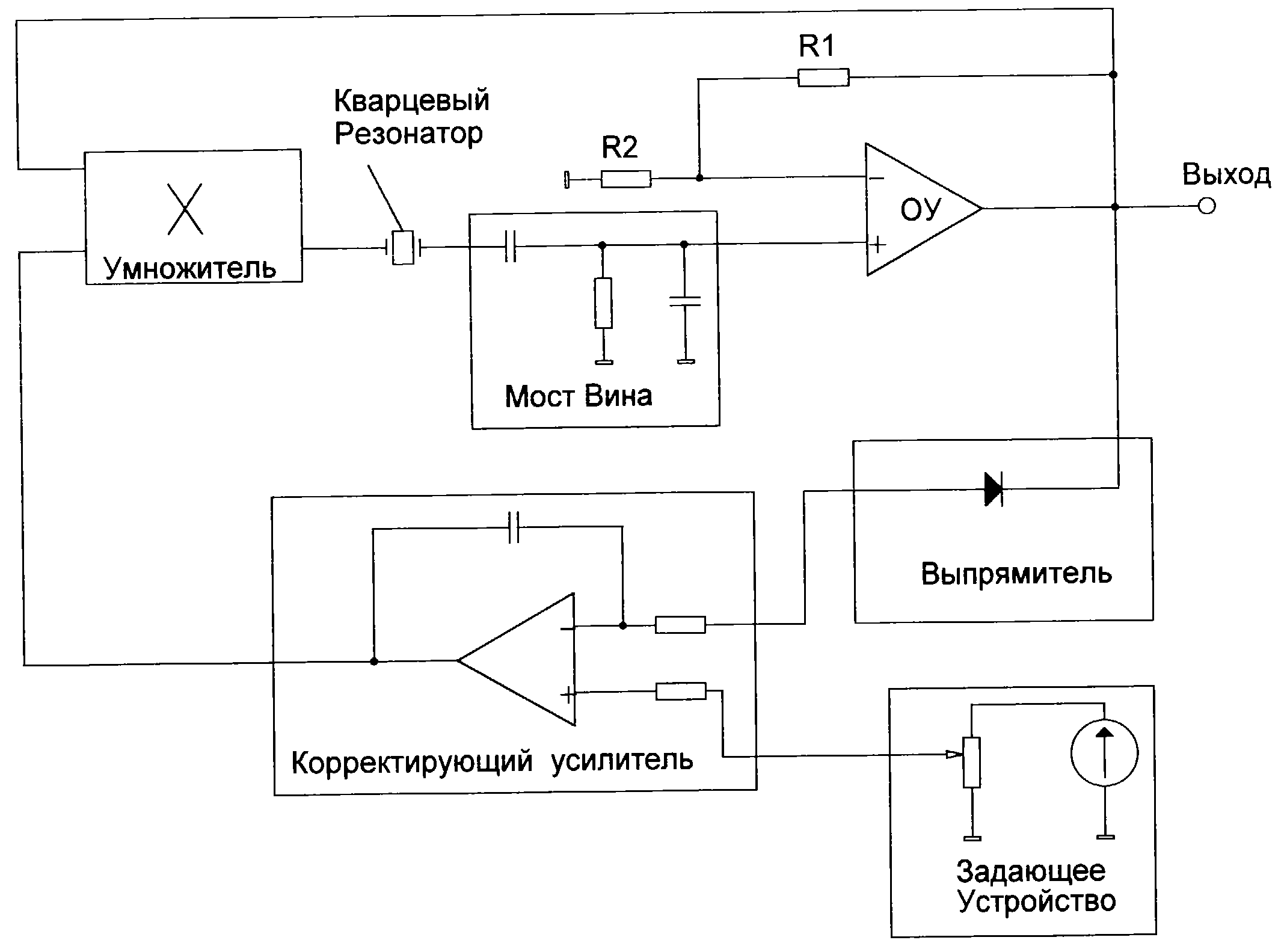 Сущность изобретения состоит в том, что в качестве управляемого напряжением аттенюатора использован аналоговый умножитель напряжения типа переменной крутизны, соединенный одним входом с выходом ОУ, другим с выходом корректирующего усилителя с дифференциальным входом (ДКУ). Инвертирующий вход ДКУ соединен с выходом выпрямителя, вход которого соединен с выходом ОУ. К неинвертирующему входу ДКУ подключен выход задающего устройства. Выход умножителя соединен с одним выводом кварцевого резонатора (КР), а другой - с входом моста Вина, выход которого соединен с неинвертирующим входом ОУ. Инвертирующий вход ОУ соединен через резисторный делитель R1, R2 с выходом ОУ.