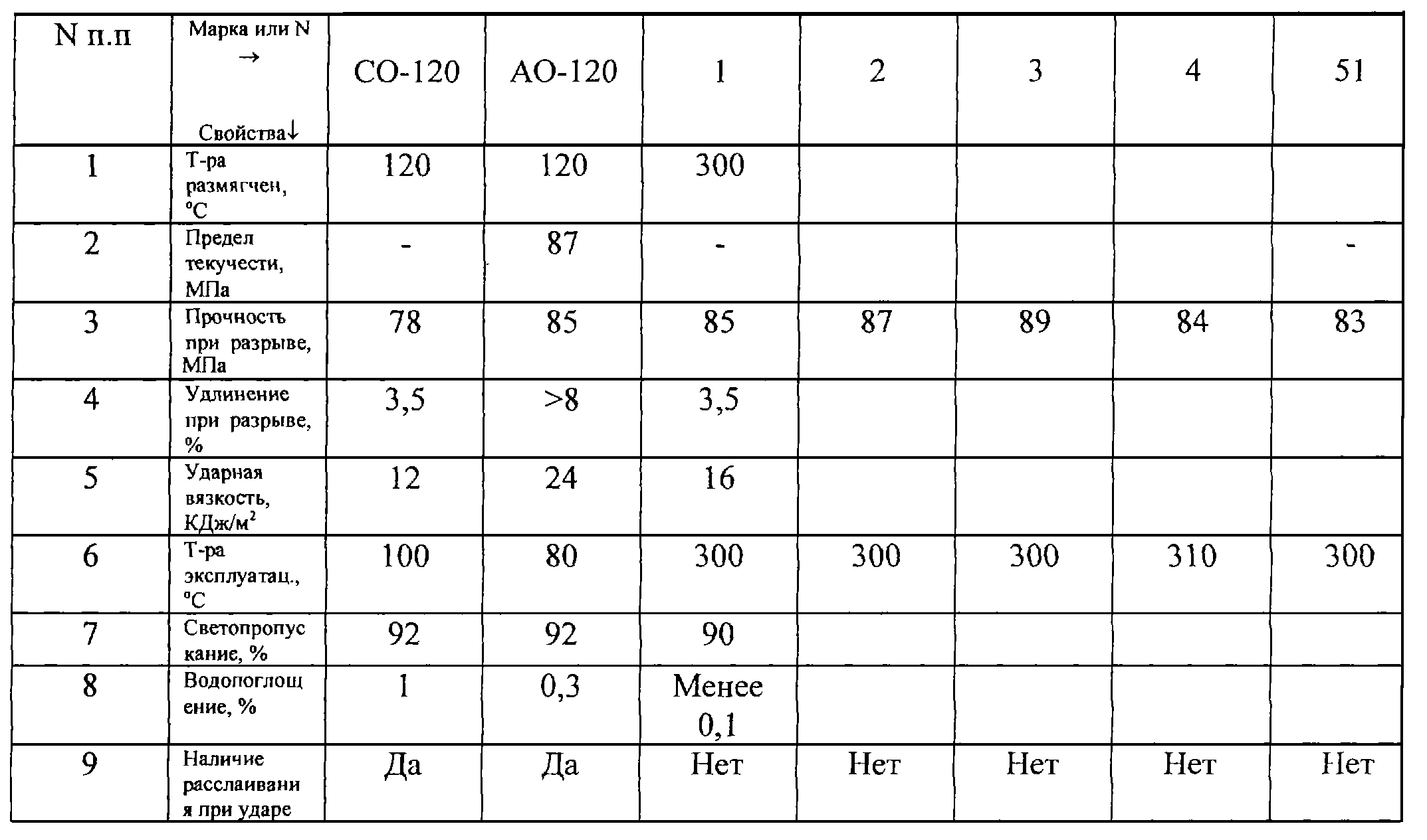 полученного продукта приведены в таблице (стекло 1). Ориентацию первого слоя осуществляли посредством сжатия или растяжения образца. Ориентационное деформирование