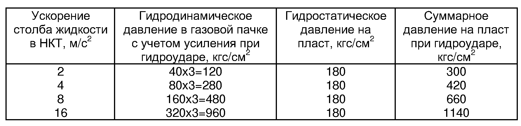 В этот момент столб жидкости в затрубье остановится и пойдет вниз, а столб жидкости в трубах получит ускорение (). В зависимости от ускорения гидродинамическое давление массы жидкости разрыва в колонне НКТ будет
