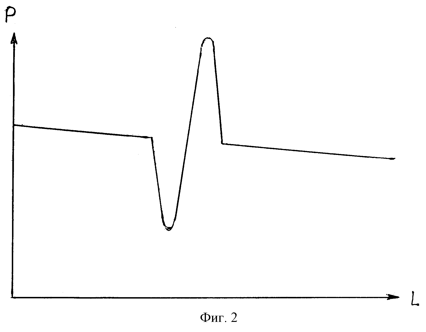 Сущность предлагаемого способа можно дополнительно объяснить на примере рассмотрения движения потока жидкости с газовой пробкой по трубопроводу с переменным проходным сечением, что соответствует скважине, где внутреннее пространство заливочной колонны сообщено с заколонным пространством, имеющим увеличенное проходное сечение. При выходе пробки газа в расширенную часть трубопровода давление в ней резко падает за счет увеличения объема. Газовая пробка в гидродинамических условиях начинает сжиматься. Время сжатия газовой пробки до равновесного давления тем больше, чем больше объем пробки. В это время впереди идущий объем жидкости замедляет движение (тормозится), а позади идущий объем жидкости приобретает положительное ускорение. В результате происходит столкновение этих объемов жидкости (гидроудар) через газовую "подушку", давление в которой резко возрастает. Эта ситуация проиллюстрирована на фиг.1 и фиг.2, где на фиг.1: 1 - заливочная колонна, 2 - заколонное пространство, 3 - разделительная пробка, 4 - газовая пробка, стрелка указывает направление потока, а на фиг.2: Р - давление, L - длина.