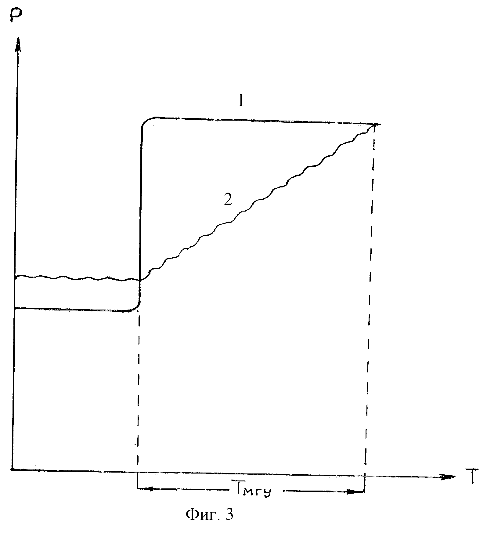 Отличительной особенностью такого гидроудара является пологий фронт волны давления по сравнению с классическим гидроударом, как показано на фиг. 3, где в координатах давление (Р) - время (Т), график на фиг.2 характеризует обычный удар, а график на фиг.3 - гидроудар через газовую пробку ("подушку"). Тмгу - время "мягкого" гидроудара.