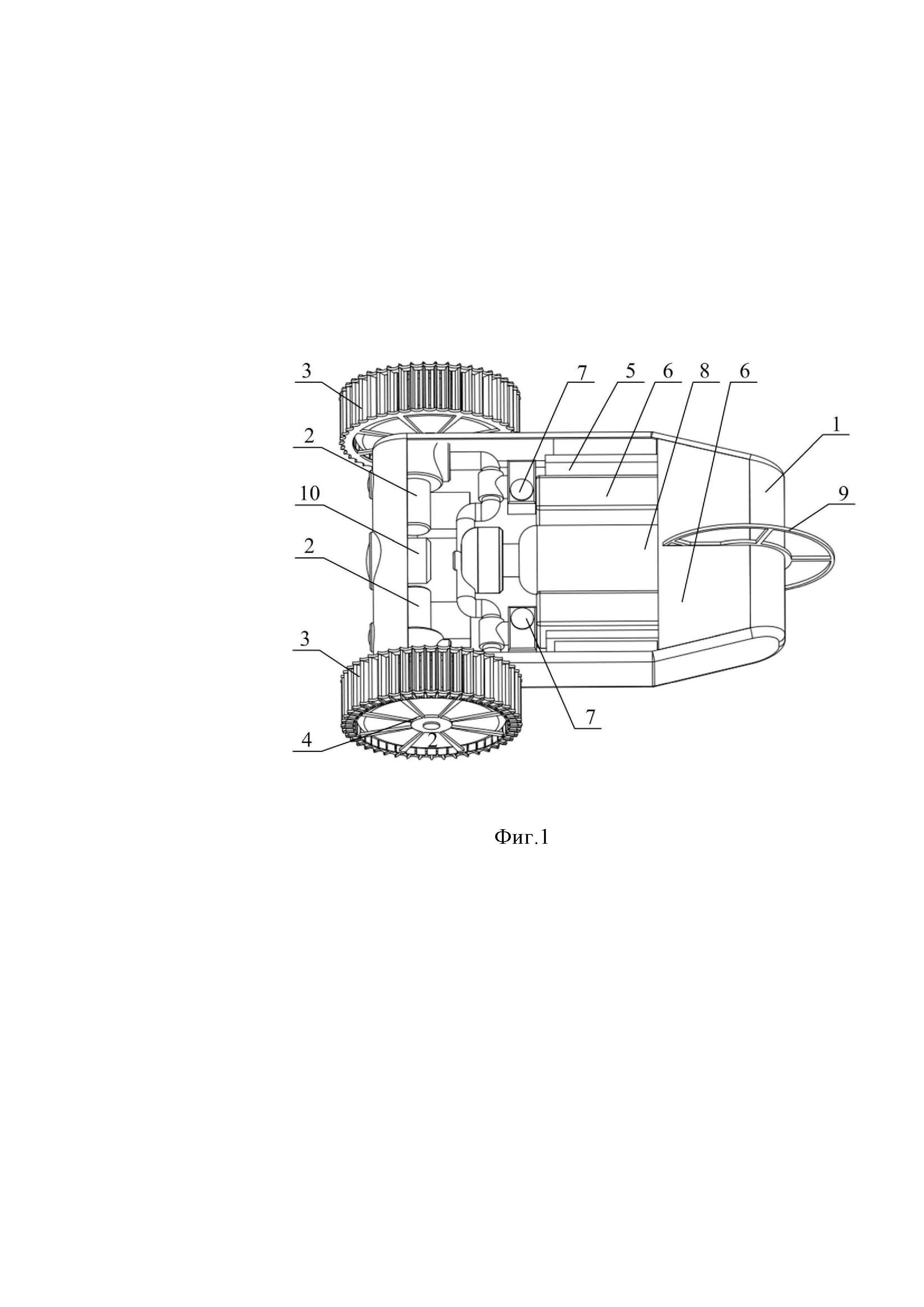 Использование: автономные необитаемые подводные аппараты для использования в различных подводных исследованиях, в частности для мониторинга подводных объектов при движении подо льдом. Задача полезной модели: повышение маневренности и эффективности движения робота за счет управляемого контакта с внутренней поверхностью льда при подледном перемещении. Сущность полезной модели: движение происходит следующим образом: в начальный момент времени баллоны 4 спущены, робот при этом имеет слабо положительную плавучесть, что позволяет оператору без труда запустить его под лед через прорубь. После этого, включается электропневматическая система и в колесные баллоны 4 закачивается воздух из резервуара 8. Баллоны 4 под давлением воздуха увеличивают свой объем и заполняют собой внутреннюю поверхность колес 3. При этом увеличивается плавучесть робота, а колеса 4 прижимаются к внутренней поверхности льда. Для движения робота по желаемой траектории осуществляется задание законов изменения скоростей вращения ведущих колес 3, при этом фактическая линейная скорость робота определяется пересчетом угловой скорости пассивного заднего колеса 9. Для недопущения возможности проскальзывания ведущих колес 3, система управления 5 обеспечивает реализацию плавного нарастания управляющих сигналов питания приводов 2, формирующих движущие моменты на ведущих колесах, не превышающих предельных сил сцепления колес с опорными поверхностями. Положительный эффект: улучшение эксплуатационных характеристик за счет повышения маневренности устройства, а также получить возможность проведения дистанционного управления устройством. 1 ил.