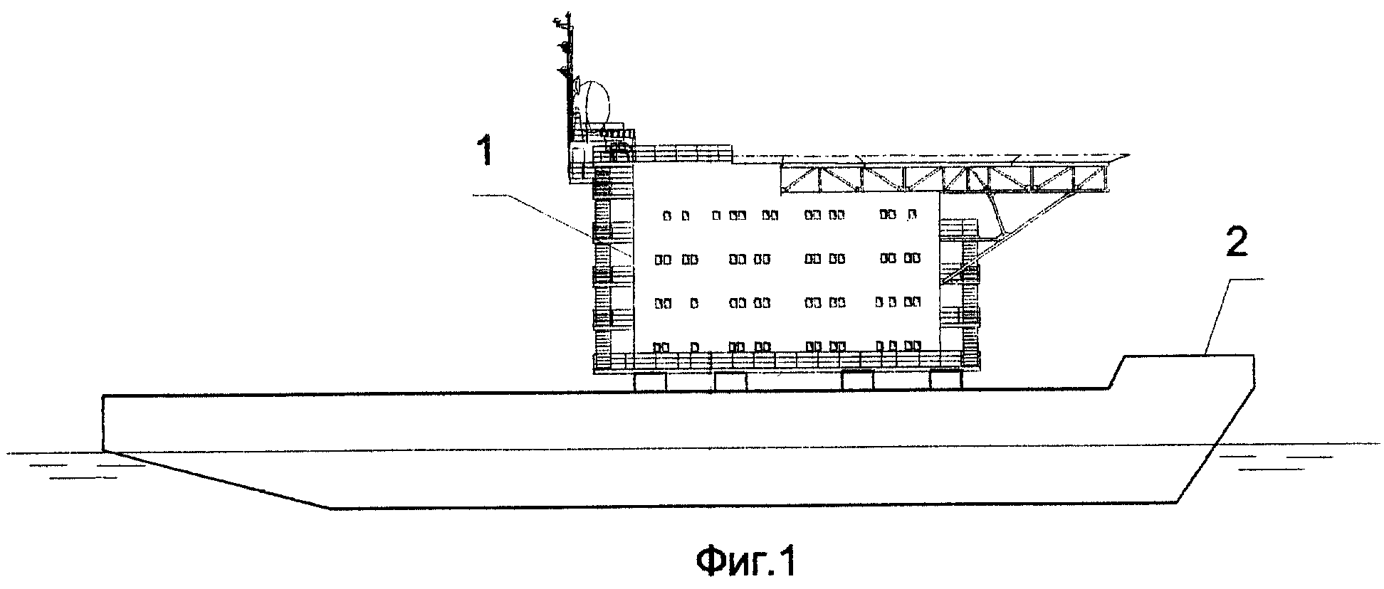 Вначале до установки модуля 1 на плавсредство 2 одним из известных методов с использованием балластных цистерн 3 плавсредства 2, например, в соответствии с авт. св. СССР №409917 МКИ В 63 В 39/14 от