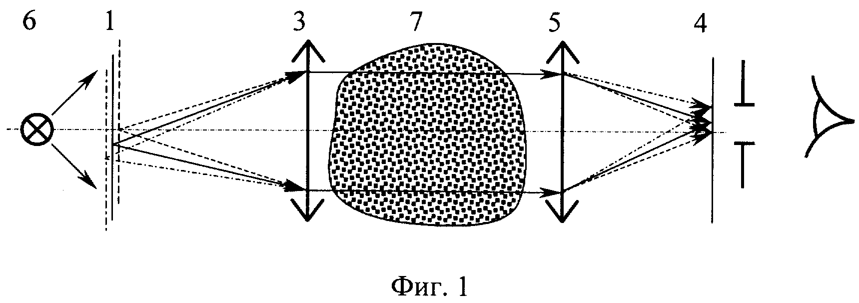 фокальной плоскости второго объектива 5 установлен экран из n параллельных полосок белого цвета на черном фоне. Указанная система полосок белого цвета
