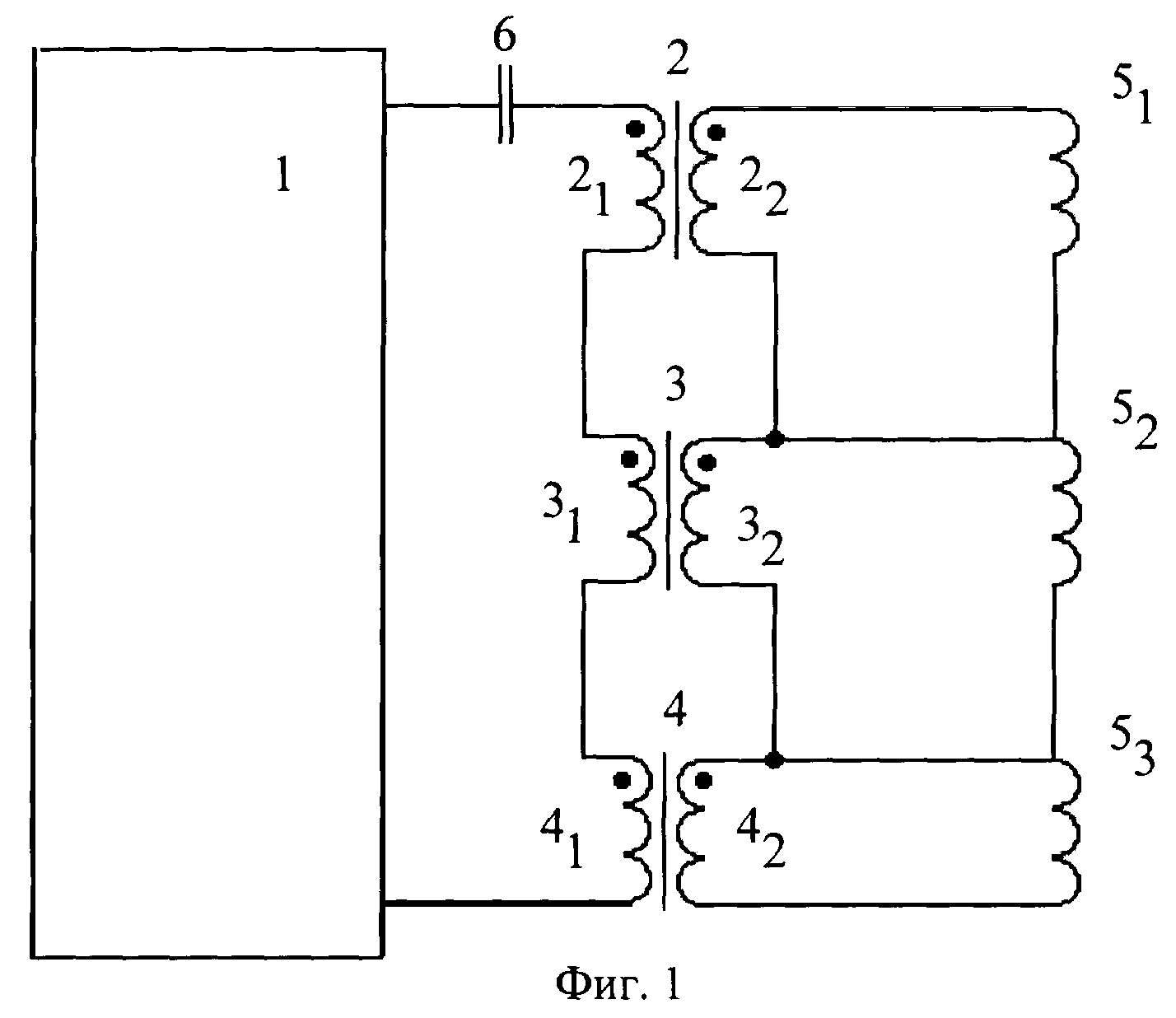 соответствующие согласующие трансформаторы 2, 3 и 4, первичные обмотки которых
