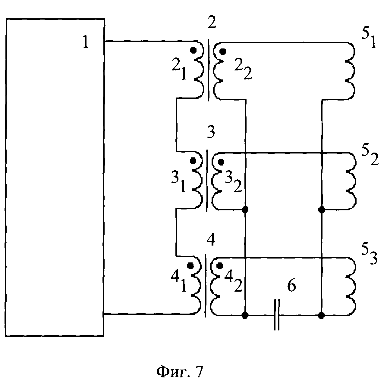 устройства, представленного на фиг.5 характеризуется тем, что согласующие трансформаторы 2, 3, 4 имеют