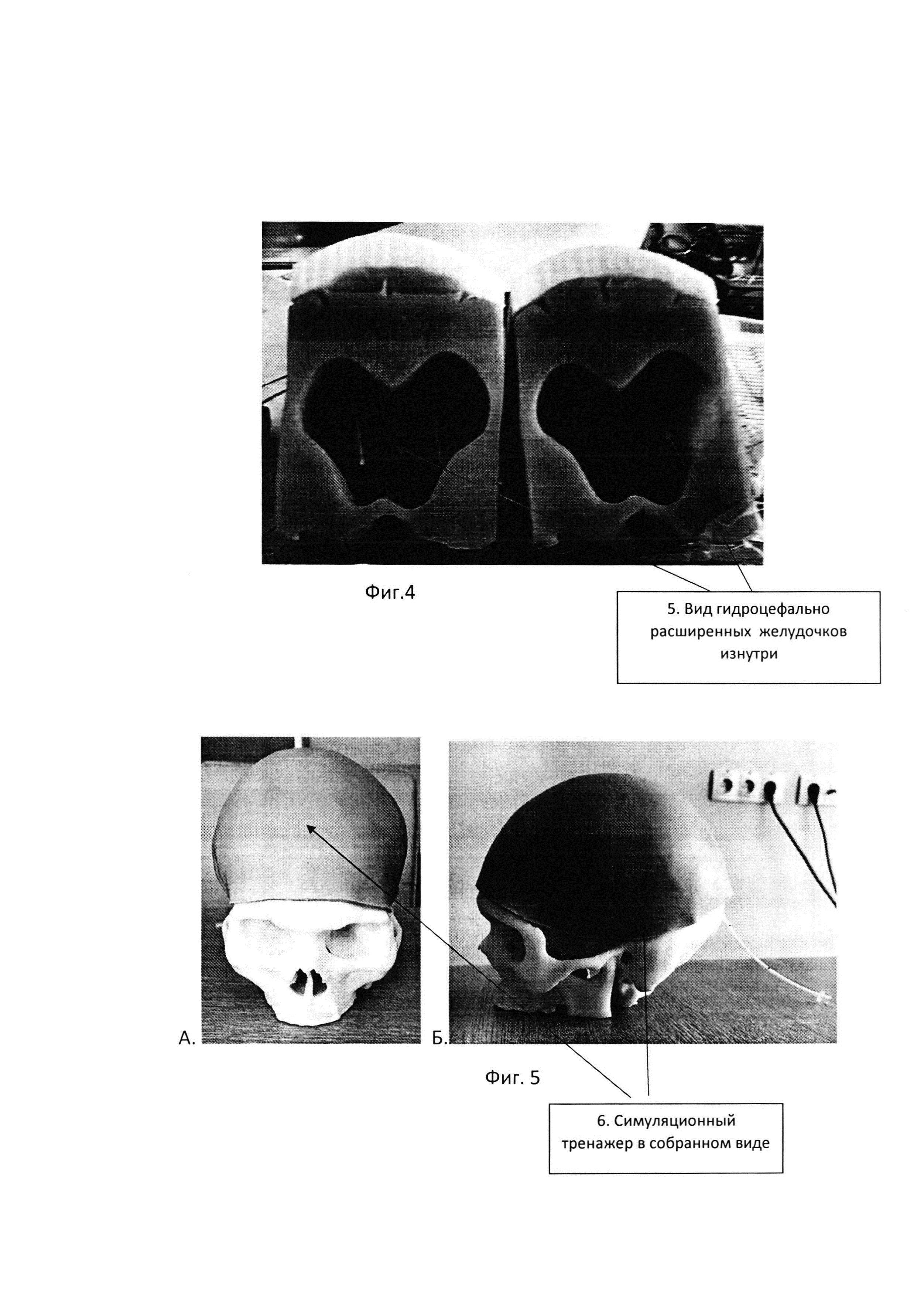 Полезная модель относится к области медицины, а именно к нейрохирургии, и предназначена для отработки и освоения техники выполнения нейрохирургической операции «Установка наружного вентрикулярного дренажа». Данная хирургическая операция проводится при различных клинических ситуациях, связанных с появлением и нарастанием внутренней гидроцефалии - патологического расширения желудочков головного мозга под давлением излишне скапливающегося ликвора. Технической проблемой, решаемой предлагаемым симуляционным тренажером, является создание устройства, обеспечивающего повышение эффективности выработки у обучающихся нейрохирургии правильных мануальных навыков установки вентрикулярного катетера и применении в дальнейшем данных навыков в реальных клинических условиях - установка вентрикулярного дренажа пациентам с минимальным риском осложнений.