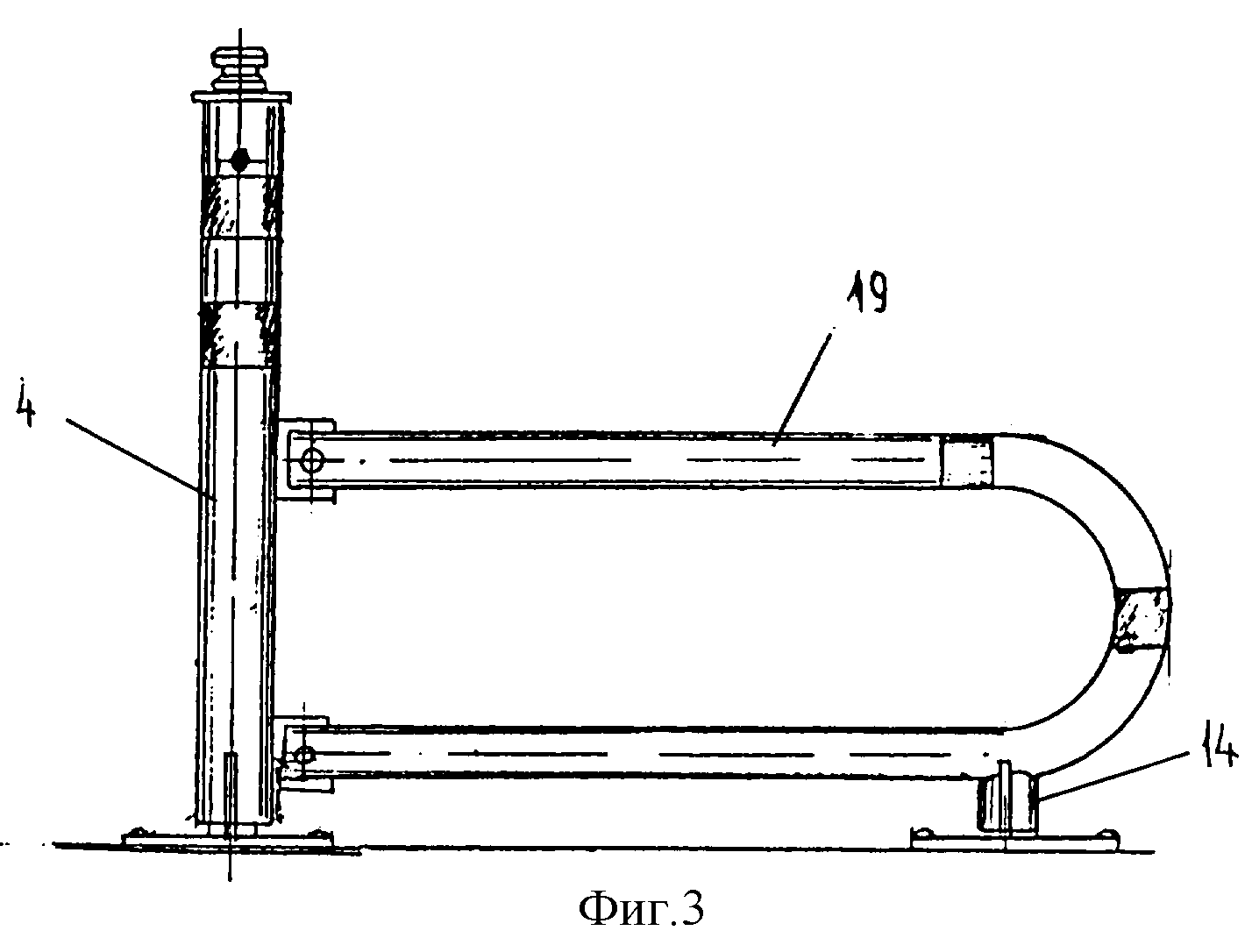 плиты 13 с возможностью фиксации стопором 17 захвата 16 при зацеплении выступа последнего за дополнительную опорную плиту 13. Управление стопором 17 осуществляется с помощью шпингалета 18. Основная стойка 4 и дополнительная стойка 14 связаны между собой соединительным элементом, выполненным, например, в виде параллельных прямых 19, прикрепленных к стойке 4, например, накладным