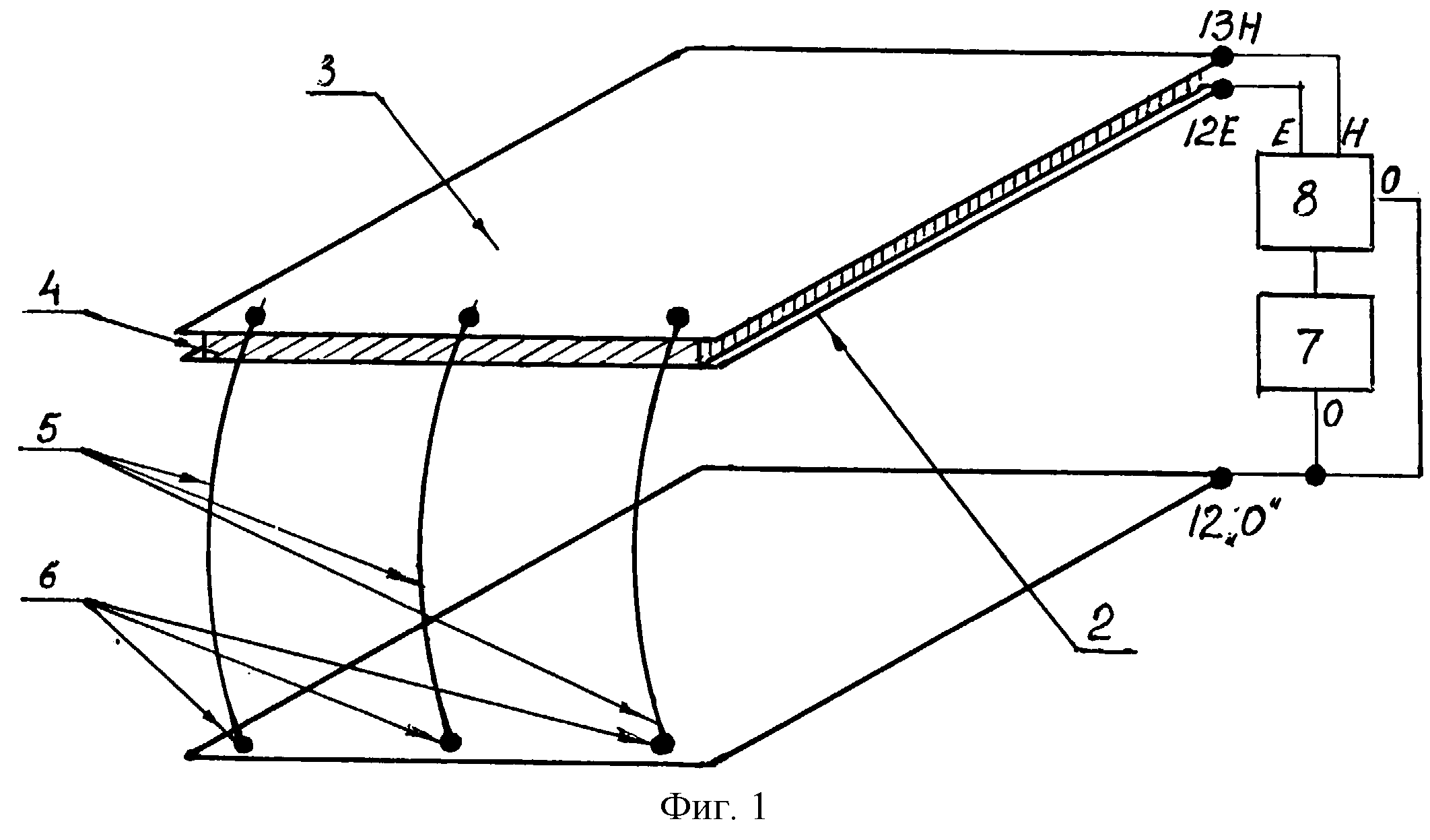 электромагнитного (ЕН) поля очень низких частот. На фиг. 1...3 обозначены: 1 - нижняя пластина, общая для плоских линий, формирующих электрическое (Е) поле и магнитное