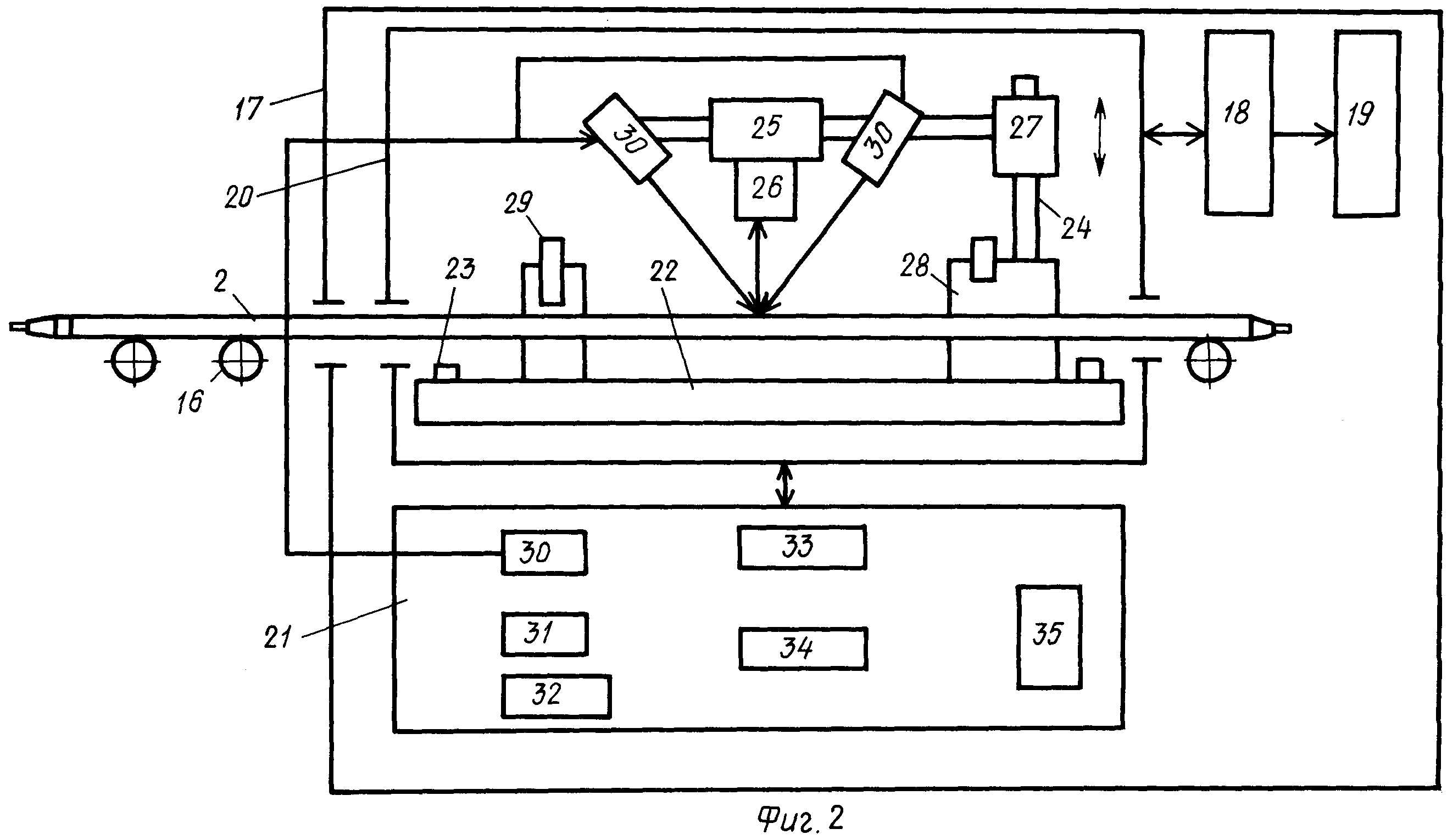 интерферометром 25, снабженным видеокамерой 26 и осветителем 30, приводом 27 перемещается вертикально и горизонтально и осуществляется сканирование измеряемого дефекта на поверхности ТВЭЛа 2. Блок 21 электронный, содержащий устройство управления осветителем 30, устройство управления фазовым модулятором 31, контроллер 32 шагового двигателя, унифицированный преобразователь 33