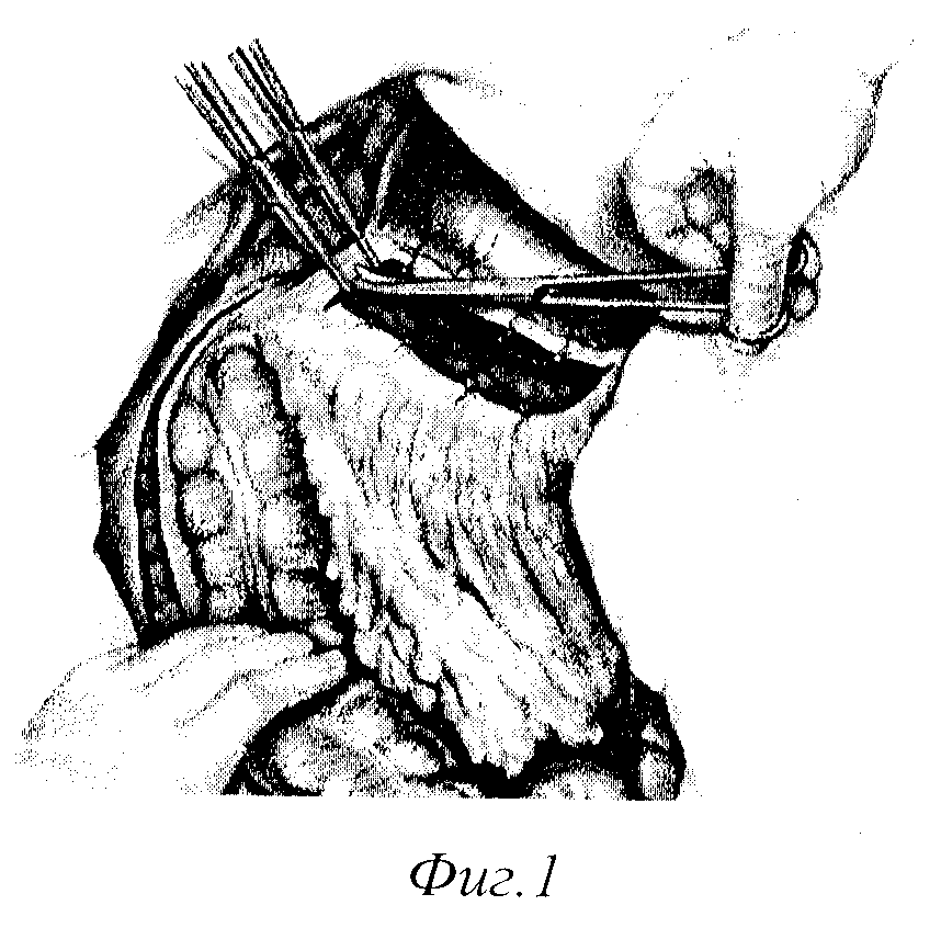 края реберной дуги по средней подмышечной линии. Изобретение поясняется фигурами: фиг.1. Мобилизация печеночного изгиба ободочной кишки. фиг.2. Перевязка и