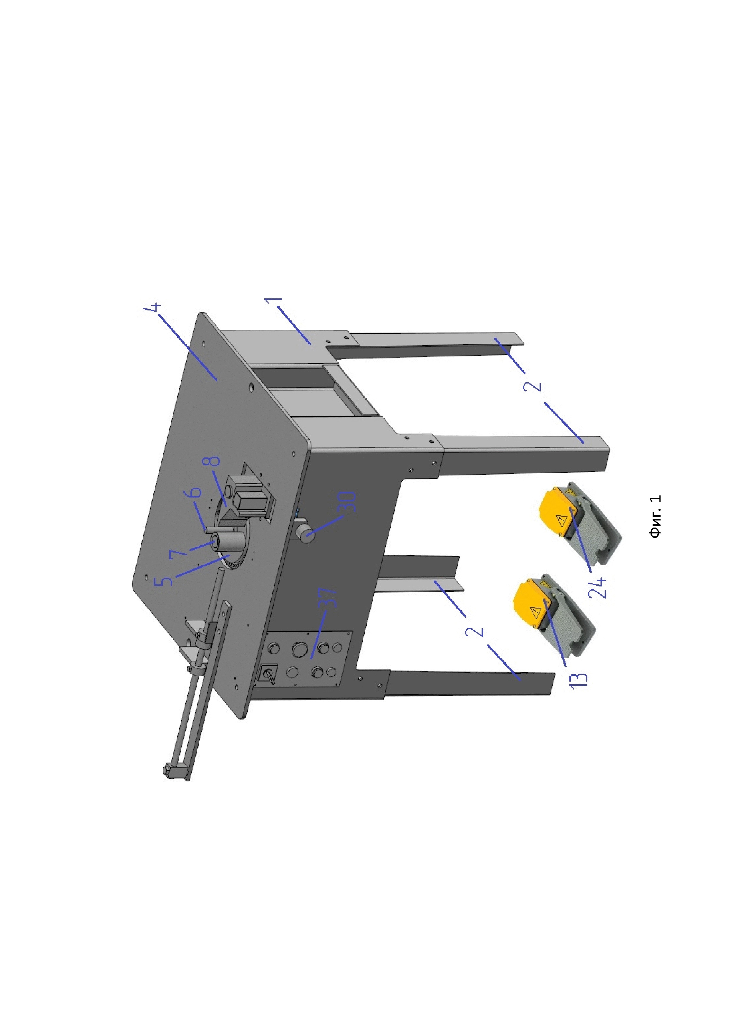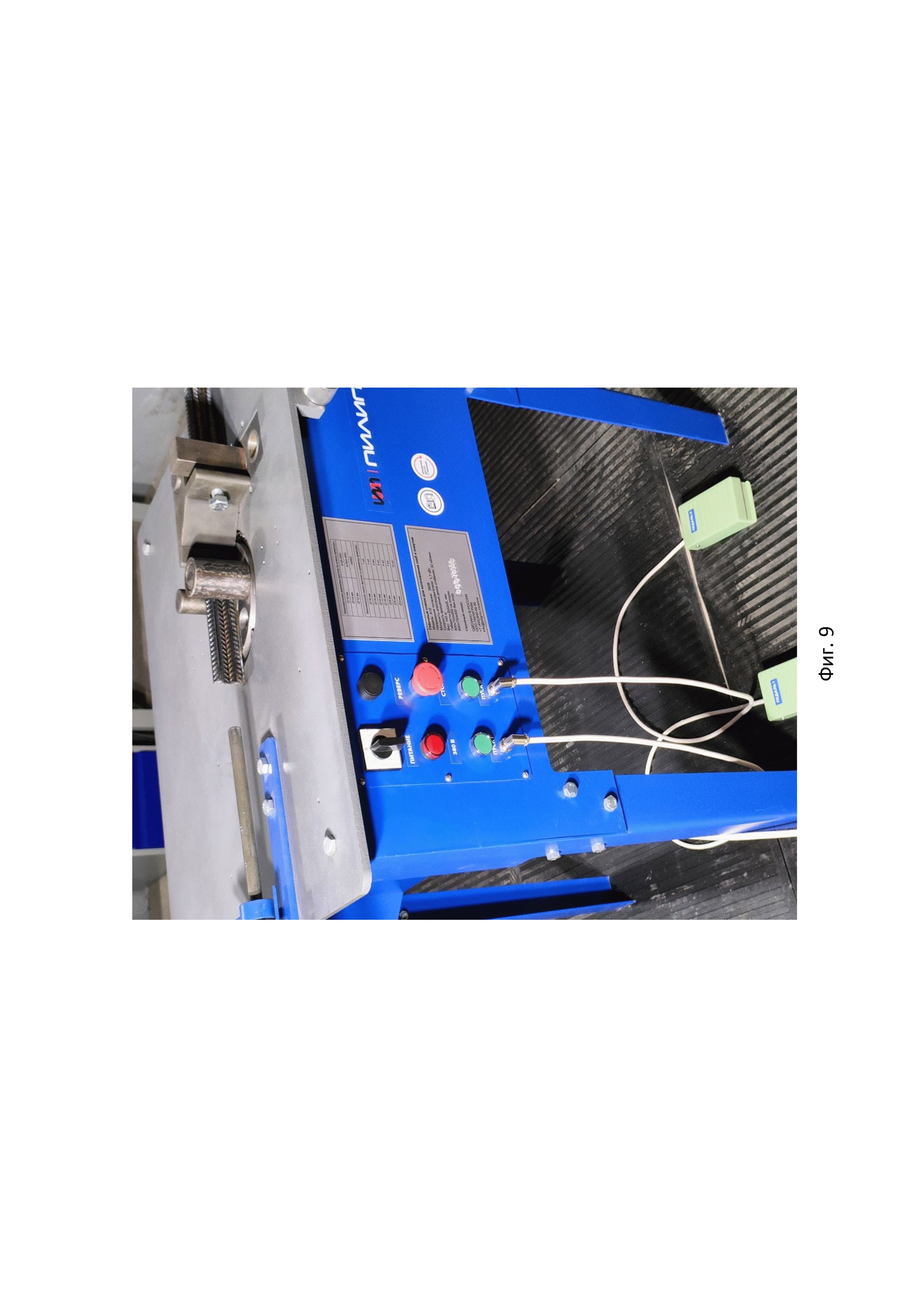1. Станок для гибки прутков арматуры, содержащий раму из каркаса со стойками, плиту с гибочным диском, электродвигатель с редуктором, связанным с гибочным диском, центральный палец с роликом и палец для гибки прутков, установленные на гибочном диске, упор, смонтированный на каретке с отверстиями, концевые выключатели останова и реверса, смонтированные на плите, элементы останова и реверса, смонтированные на наружной поверхности гибочного диска, и электропедаль, отличающийся тем, что он дополнительно снабжен приспособлением для установки длины прутков, выполненным в виде двух соосно установленных друг над другом горизонтальных направляющих, нижняя из которых неподвижно закреплена на плите, а верхняя смонтирована с возможностью движения и имеет две стопорные втулки, каждая из которых снабжена ограничителем и прижимным элементом для ограничителя, при этом ближняя к упору стопорная втулка снабжена элементом для поворота ограничителя на угол 180°, кроме того, снабжён элементом реверса, концевым выключателем реверса и второй электропедалью, причём элемент реверса и дополнительный элемент реверса выполнены в виде цилиндрических штифтов разной длины, в гибочном диске, в верхней его части, выполнено кольцо прямоугольного сечения, по периферии которого исполнены сквозные отверстия, в которых размещены упомянутые штифты с возможностью контакта с соответствующими концевыми выключателями реверса, элемент останова выполнен в виде сегмента смонтированного на наружной поверхности гибочного диска, а упор установлен с возможностью регулирования его положения посредством винта с ограничителем, болта и квадратного пальца. 2. Станок по п.1, отличающийся тем, что плита, гибочный диск и каретка упора смонтированы в одной плоскости. 3. Станок по п.1, отличающийся тем, что каждый элемент реверса выполнен с возможностью автономного контакта с соответствующим концевым выключателем реверса и связан со своей электропедалью. 4. Станок по п.1, отличающийся тем, что редуктор выполнен в виде закрытого редуктора червячного или цилиндрического, или планетарного типа. 5. Станок по п.1, отличающийся тем, что упор выполнен Т-образной формы, а ограничитель винта имеет U-образную форму. 6. Станок по п.1, отличающийся тем, что стойки рамы выполнены съемными, а каркас выполнен с пазом для хранения оснастки станка и с окнами для панели управления станком и для силового разъема. 7. Станок по п. 6, отличающийся тем, что панель управления станком содержит кнопки «питание», «пуск I», «пуск II», «стоп» и «реверс», индикатор напряжения и разъемы для электропедалей. 8. Станок по п.1, отличающийся тем, что он снабжен защитным электромеханическим кожухом, закрывающим рабочую поверхность плиты в зоне гибочного диска и упора.