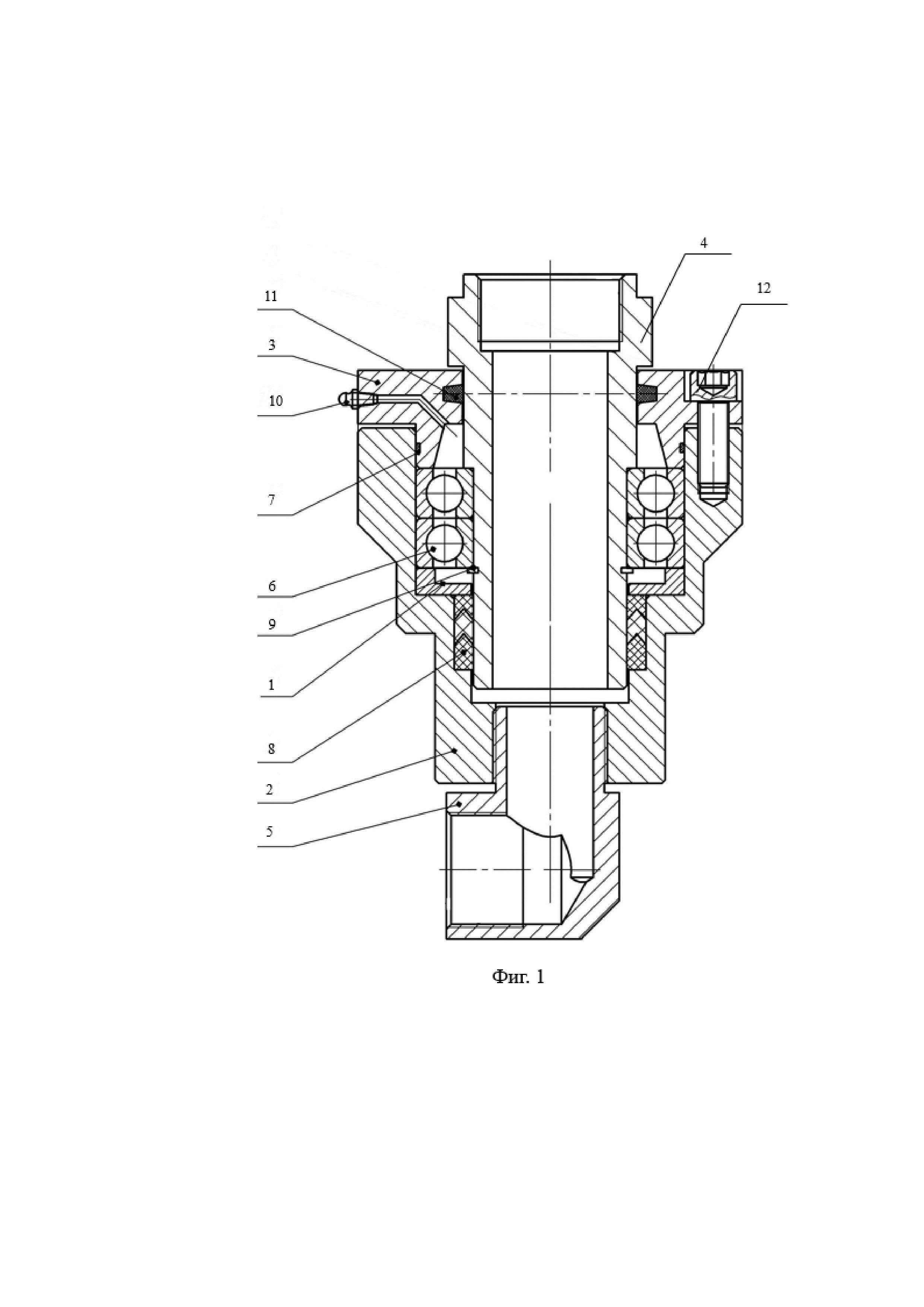 Полезная модель относится к литейному производству, в частности к узлам для подвода гидравлической жидкости в машинах литья под давлением. Техническое решение по полезной модели предназначено для подвода воды в смеситель автоматической формовочной линии в литейном производстве, обеспечивающее водяное орошения для увлажнения формовочной смеси при ее перемешивании с подачей воды в полость перемешивания снизу миксера через центральную колонну. Из области техники известно устройство поворотного соединения трубопроводов по патенту на полезную модель RU № 11295, приоритет от 25.02.1999, оснащенное втулкой и содержащее соосно установленные один в другом с возможностью вращения с зафиксированными в осевом направлении концами трубопроводов, на одном из которых образована канавка с установленным уплотнительным кольцом, при этом втулка с кольцевыми полостями выполнена разрезанной под углом к оси вращения и закрепленной на одном из концов трубопровода, а канавка под уплотнительное кольцо образована сдвинутыми в осевом направлении двумя частями втулки. Известно поворотное соединение трубопровода по патенту на полезную модель RU № 181954, приоритет от 10.05.2018, содержащее сопрягаемые охватывающую и охватываемую обоймы, между которыми установлены поворотный в виде подшипника скольжения и уплотнительный, выполненный в виде закрепленных на внутренних и наружных кольцах подшипника термоизоляционных втулок, элементы, соединенные с обоймами патрубками. Патрубок, соединенный с охватываемой обоймой, выполнен в виде углового штуцера с возможностью соединения с термостойким шлангом, а патрубок, соединенный с охватывающей обоймой, выполнен термоизоляционным с выпускным соплом на конце и втулкой для присоединения к резервуару. В вышеприведенных конструкциях не предусмотрено винтовое соединение, обеспечивающее подтяжку при появлении течи минерального масла под давлением. Также известно поворотное соединение трубопровода по патенту на полезную модель RU № 77934, приоритет от 24.01.2008, содержащее обоймы с кольцевыми канавками на сопрягаемых поверхностях для установки поворотных элементов в виде тел качения, в которых, в двух оппозитно расположенных канавках установлены поворотные элементы в виде шариков, а также уплотнительный элемент из прокладки, манжеты, опорного кольца, соединительный элемент в виде фланца, при этом на сопрягаемой поверхности одной из обойм выполнены кольцевые канавки для установки в них поворотных элементов - роликов, канавки расположены симметрично относительно канавки, в которой установлены поворотные элементы в виде шариков, а одна из обойм - охватываемая имеет подвижное соединение с охватывающей обоймой посредством шариков и роликов. В данной конструкции отсутствует возможность закачивания масла в полость подшипников через пресс-масленку для обеспечения анти- заклинивающего эффекта, а винтовое соединение ограничено фиксацией, исключая возможность его регулирования. В качестве прототипа выбрано поворотное соединение с подшипниковым соединением по патенту на изобретение RU № 2154225, приоритет от 12.06.1995 г., конвенционный приоритет от 15.06.1994 US 08/260,160. Охватываемый соединитель подшипникового устройства имеет центральную ось, первый конец и множество наружных кольцеобразных канавок, каждая из которых имеет, д