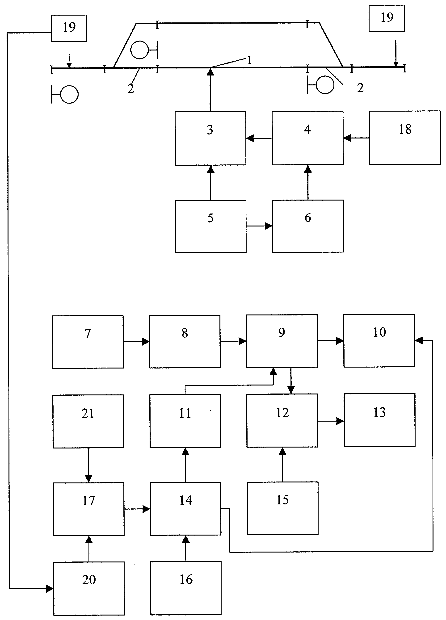 какой-либо вышеуказанной секции блок 6 определения установки маршрутов дает команду на средство 4 выключения блока кодирования и кодирование рельсовой цепи 1 прекращается. Прекратить кодирование может