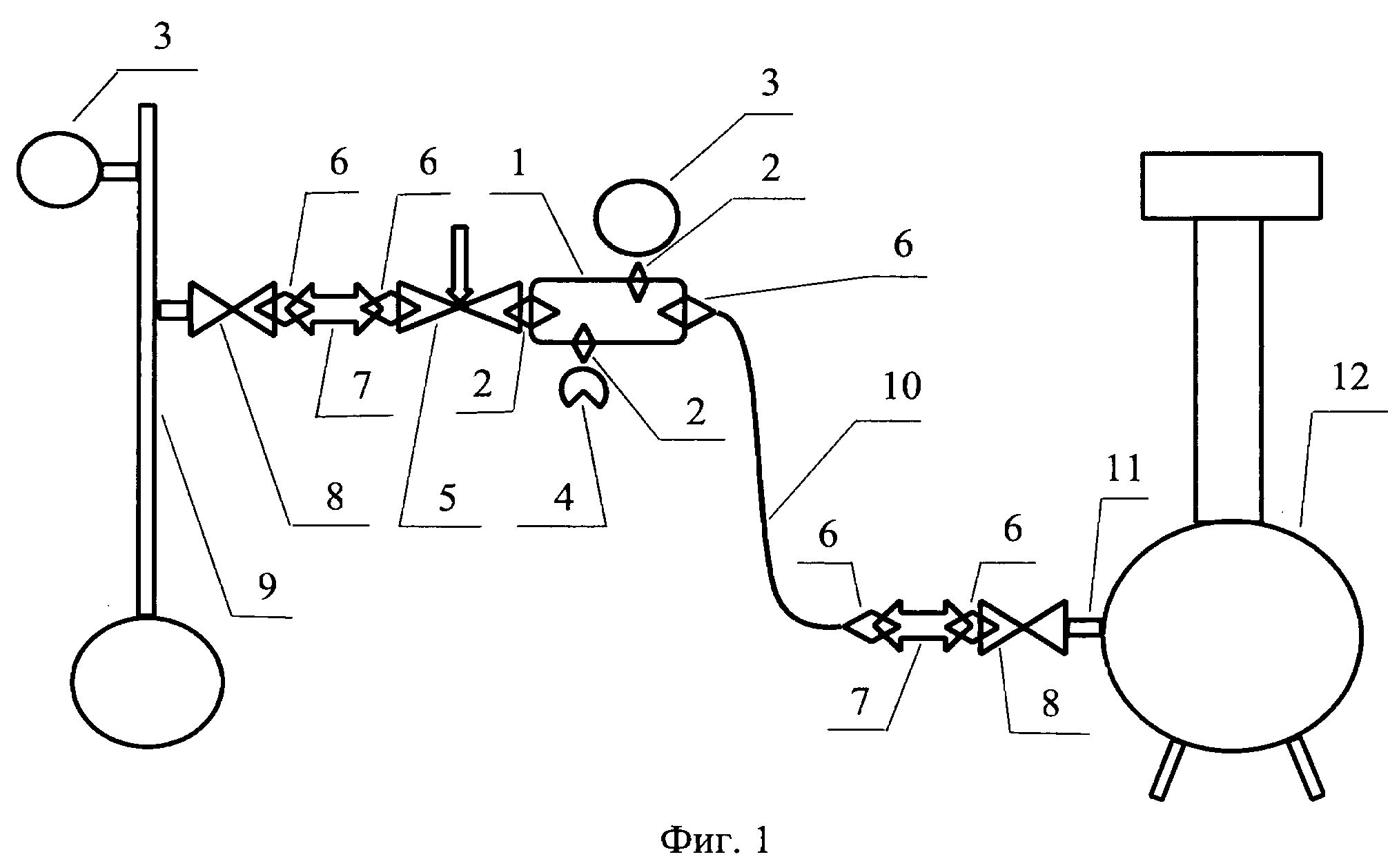 Полезная модель относится к области газовой промышленности и может быть использована для выравнивания давления между полостями газового оборудования, в частности при техническом обслуживании и ремонте шаровых кранов для выравнивания давления в корпусе узла крана шарового (далее - КШ) с давлением в магистральном газопроводе. Выравнивание давления в корпусе узла КШ с давлением в магистральном газопроводе (далее - МГ) является обязательной процедурой, которую необходимо выполнять перед каждым открытием КШ [Руководство по монтажу, наладке, эксплуатации и техническому обслуживанию МА39183М-1400 РЭ (Тяжпромарматура), п. 1.9.2]. В отдельных конструкциях КШ предусмотрена система уравновешивания давления [Руководство по монтажу, наладке, эксплуатации и техническому обслуживанию МА39183М-1400 РЭ (Тяжпромарматура), п. 1.9.1]. Основными недостатками данной системы являются: отсутствие возможности контроля давления в корпусе узла крана манометрическим способом, вследствие чего затруднено принятие решения об окончании процесса выравнивания давления; отсутствие регулирующего устройства для последовательного подъема давления в корпусе узла крана, вследствие чего выравнивание давления приходится производить дросселированием проходными сечениями отдельных кранов DN 15 мм, что приводит к преждевременному выходу их из строя и запрещено в соответствии с нормативно-технической документацией [Руководство по монтажу, наладке, эксплуатации и техническому обслуживанию МА39183М-1400 РЭ (Тяжпромарматура), п. 2.1.15], [СТО Газпром 2-2.3-385-2009 «Порядок проведения технического обслуживания и ремонта трубопроводной арматуры», п. 10.3]. Наиболее близким аналогом к заявленной полезной модели является устройство для накачки шин и определения давления в них (см. RU 118597 U1, опубл. 27.07.2012). Основными недостатками известного устройства являются: отсутствие узла сброса давления, вследствие чего возникает риск получения травмы гибким шлангом; привязка к источнику нагнетания (компрессор) сжатого воздуха. Задачей полезной модели является повышение безопасности процесса; выравнивание давления газа между полостями газового оборудования. Техническим результатом полезной модели является создание устройства для постепенного контролируемого выравнивания давления в корпусе узла КШ с давлением в МГ. Поставленная задача решается, а технический результат достигается путем применения устройства, состоящего из узла контроля и сброса давления, содержащего манометр, рукава высокого давления и присоединительные переходники, в котором узел контроля и сброса давления содержит запорно-регулирующий и сбросной клапаны. Заявленное устройство, а также способ его применения представлены на фиг. 1. Обозначения, приведенные на фиг. 1: 1 - узел контроля и сброса давления; 2 - сварное соединение; 3 - манометр; 4 - сбросной клапан; 5 - клапан запорно-регулирующий; 6 - резьбовое соединение; 7 - переходник; 8 - секущий кран; 9 - источник отбора транспортируемой среды; 10 - рукав высокого давления; 11 - дренажный трубопровод КШ; 12 - корпус узла КШ. Заявленное устройство состоит из узла контроля и сброса давления (1), выполненного в виде цельного отрезка металлического прутка (сталь 09Г2С), к верхней части которого при помощи сварного соединения (2) закреплен манометр (3), в нижней части которого при помощи сварного соедин