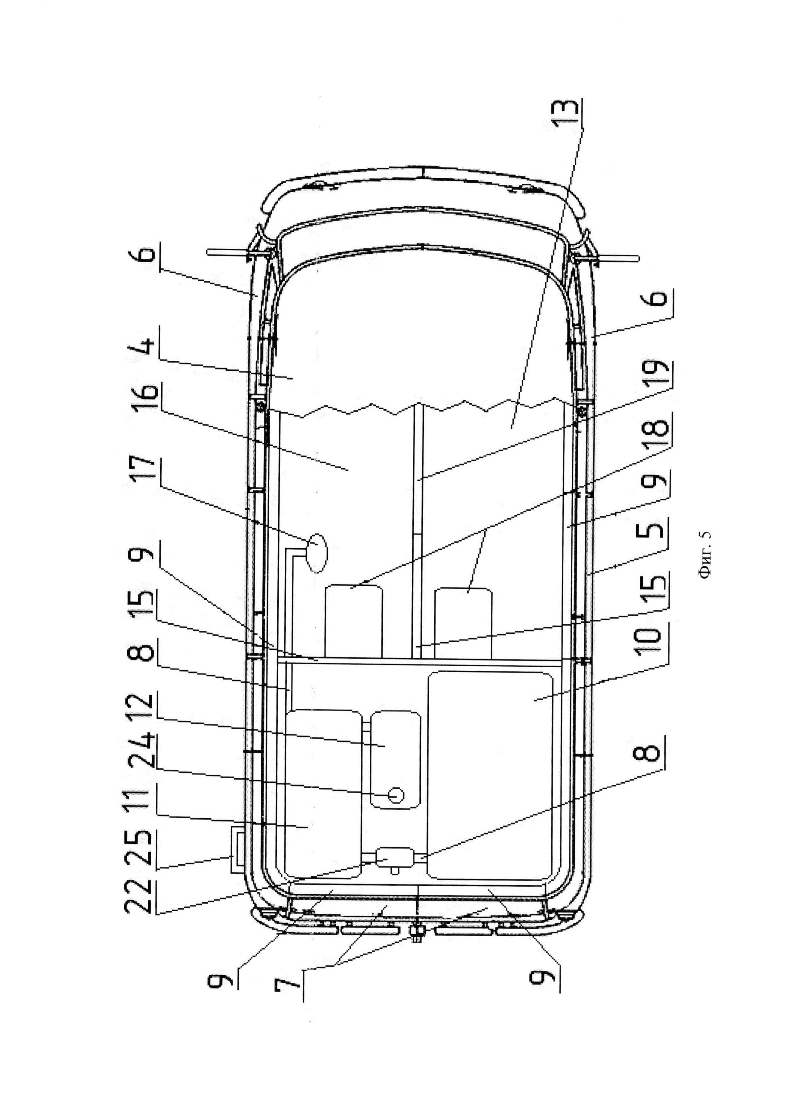 При этом, из пассажирского отделения к отделению для помывки (13) и помывочному отделению (16) выведены снизу воздуховоды, с помощью которых внутрь теплоизолированного кузова (4) подается теплый воздух от штатного отопителя, функционирующего при работающей силовой установке, что позволяет поддерживать комфортную температуру внутри теплоизолированного кузова (4).
