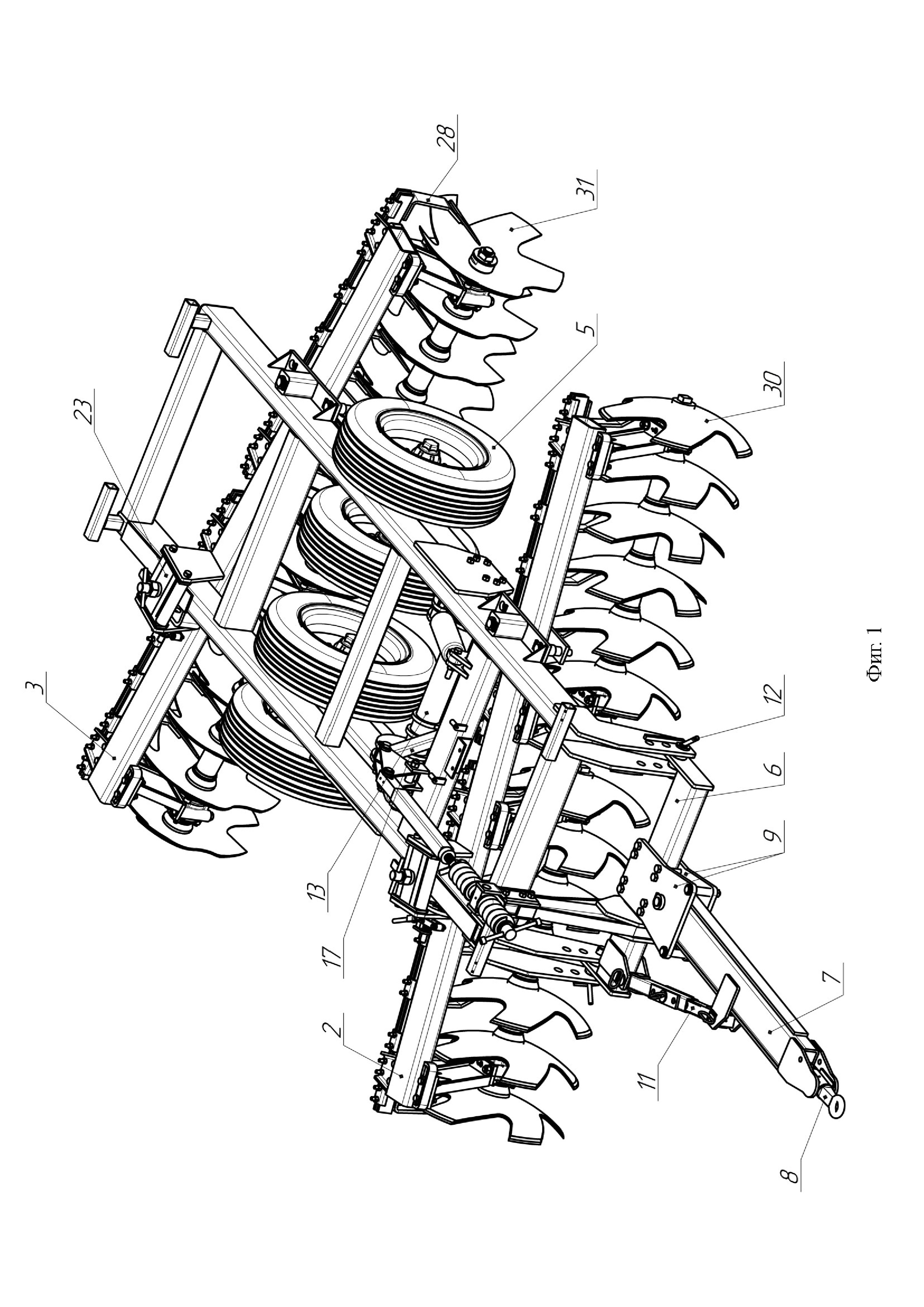 Дисковая борона, содержащая раму с поперечными балками и закрепленными на ней двумя гидроцилиндрами подъема и опускания опорно-транспортных колес, сферическими дисковыми батареями, механизмом регулировки угла атаки дисков и опорно-транспортными колесами, отличающаяся тем, что тяговое дышло, состоящее из поперечного бруса, на котором крепится прицепное устройство со сцепной серьгой, вращающейся вокруг своей оси на 360°, двух пластин и оси с возможностью смещения по поперечному брусу и ограничения положения на нем посредством телескопической трубы в трех положениях, соединено с рамой пальцами с возможностью регулирования по высоте и опорно-транспортными колесами посредством механизма стабилизации, причем опорно-транспортные колеса установлены посередине рамы между передними и задними сферическими дисковыми батареями, расположенными V-образно относительно друг друга, на круглой раме, выполненной в виде рычажного механизма с общей осью, соединенной с двумя гидроцилиндрами подъема и опускания опорно-транспортных колес и механизмом стабилизации, состоящим из винта, двух пружин, двух тяг и промежуточного маятникового устройства, при этом передние и задние сферические дисковые батареи крепятся на боковых брусьях рамы с одной стороны посредством двух осей, одна из которых является поворотной, а вторая - крепежной, а с другой стороны крепятся посредством механизма регулирования угла атаки дисков, состоящего из сектора, имеющего регулировочные отверстия с интервалом от 8° до 46°, стопорных пальцев, блокировочной пластины с вращающимися осями, стопорного винта и контргайки, причем сферические дисковые батареи состоят из траверсы, на которой крепятся чистики и секции сферической дисковой батареи, состоящие из квадратного вала сечением 50 мм, на который установлены диски с серповидным вырезом диметром 810 мм, имеющие 5 лепестков по диаметру, режущая кромка которых направлена в сторону вращения диска, с расстоянием между углами наружных и внутренних кромок лепестков 285 мм, промежуточные втулки, имеющие длину 280 мм и подшипниковые корпуса в количестве 4 шт. на каждой сферической дисковой батарее, благодаря которым сферическая дисковая батарея посредством опор крепится к траверсе, при этом диски передней сферической дисковой батареи в количестве 14 шт. установлены выпуклой стороной влево по ходу движения агрегата со смещением каждого лепестка диска от крайнего левого в обратную сторону вращения на величину, равную 2/3 ширины лепестка диска относительно предыдущего, образовывая их расположение по спирали, причем диски задней сферической дисковой батареи в количестве 14 шт. установлены выпуклой стороной вправо по ходу движения агрегата со смещением каждого лепестка диска от крайнего правого в обратную сторону вращения на величину, равную 2/3 ширины лепестка диска относительно предыдущего, образовывая их расположение по спирали, причем количество дисков на передней и задней сферических дисковых батареях является одинаковым и четным.