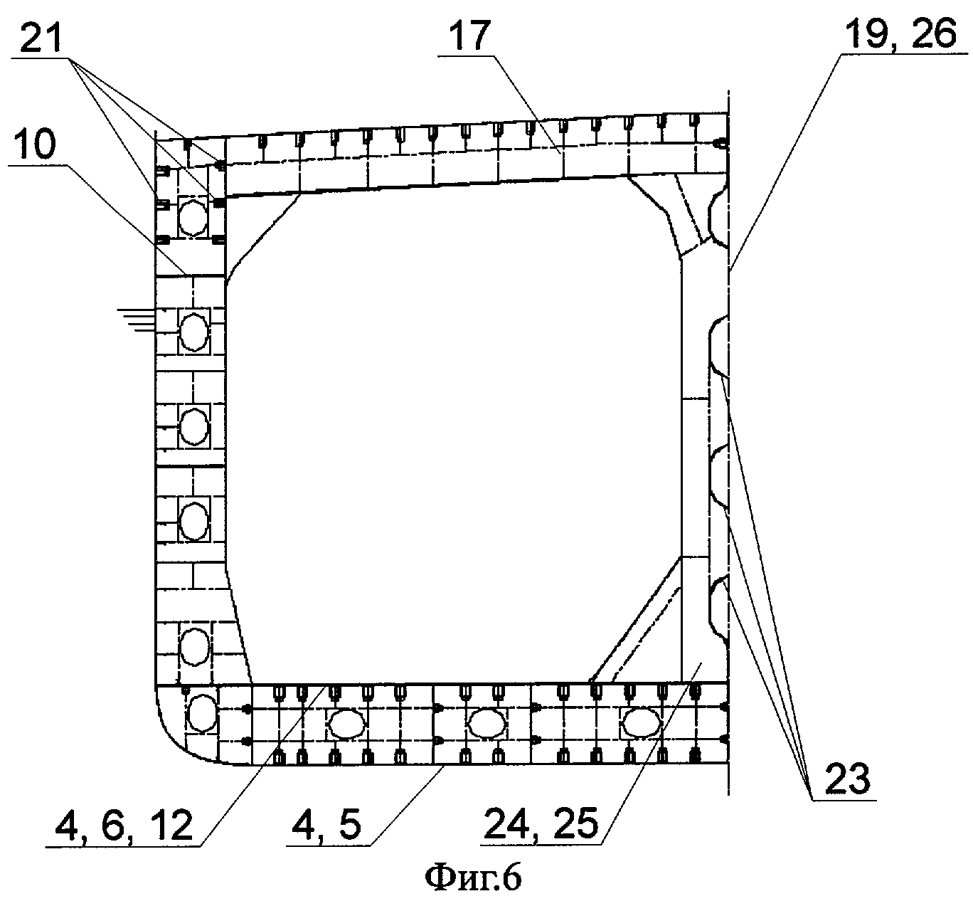 - танк танкера - судна для наливных грузов; на фиг.5 - поперечный разрез танкера в зоне расположения танков; на фиг.6 - фрагмент поперечного разреза танкера в зоне