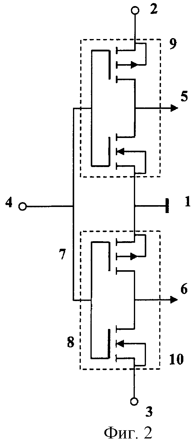 Новое устройство работает следующим образом. Если на первый вход 13 подается напряжение низкого уровня, а на второй вход 14 отрицательное напряжение высокого уровня, то первый транзистор 17 открывается и через открытый второй транзистор 18 положительное напряжение шины 2 передается на выходную шину 15 и выделяется на элементе нагрузки 16. При этом цепь от шины 3 источника отрицательного напряжения к выходной шине разомкнута, так как третий транзистор 19 запирается при отрицательном напряжении на затворе и четвертый транзистор 20 закрыт при низком уровне напряжения на затворе.