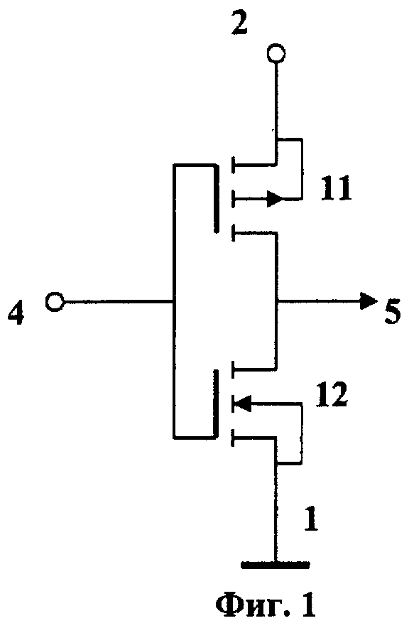 р-проводимости, а второй 12 - с каналом n-проводимости. Транзисторы соединены последовательно и подключены к шине питания 2 и к общей шине 1. Затворы